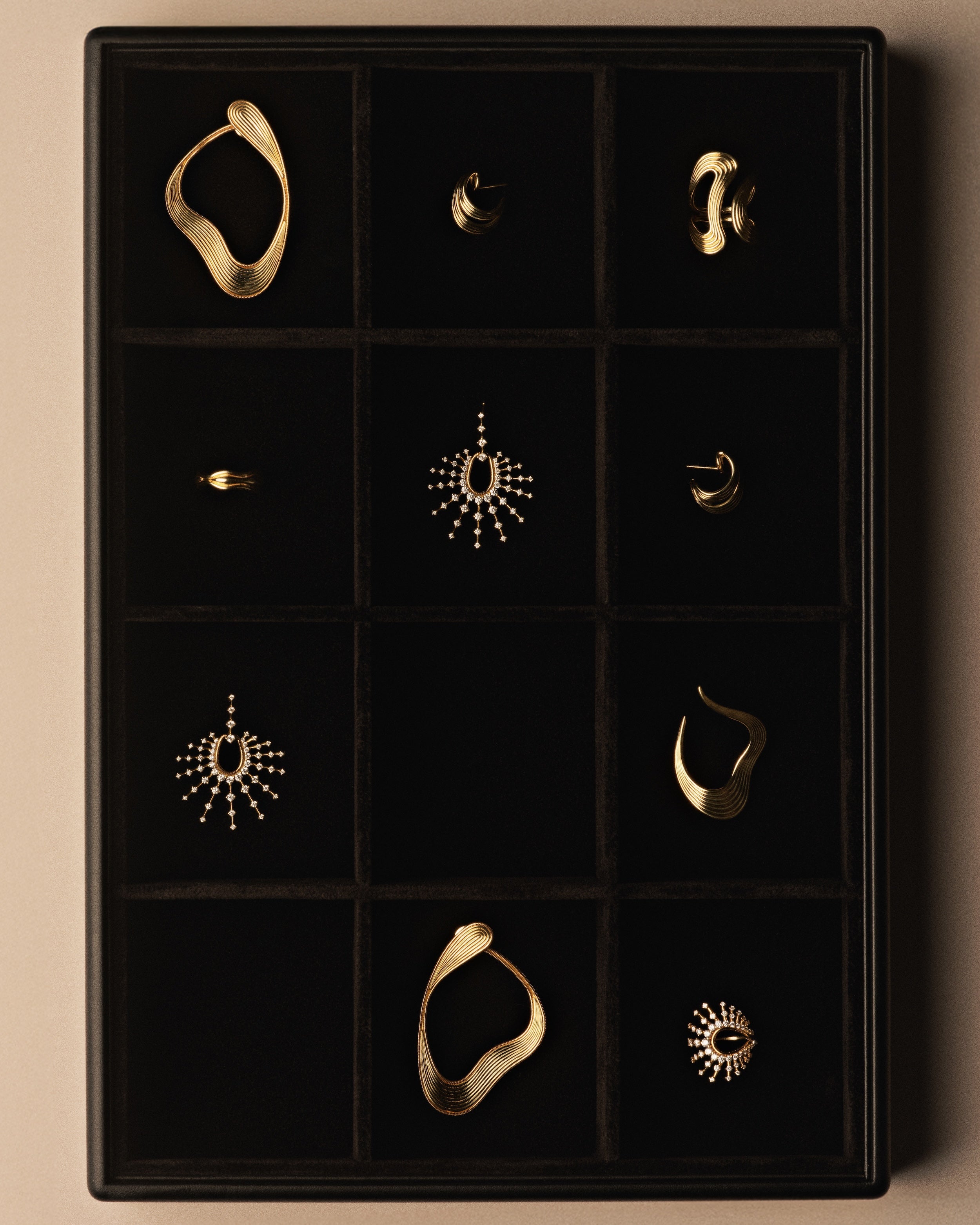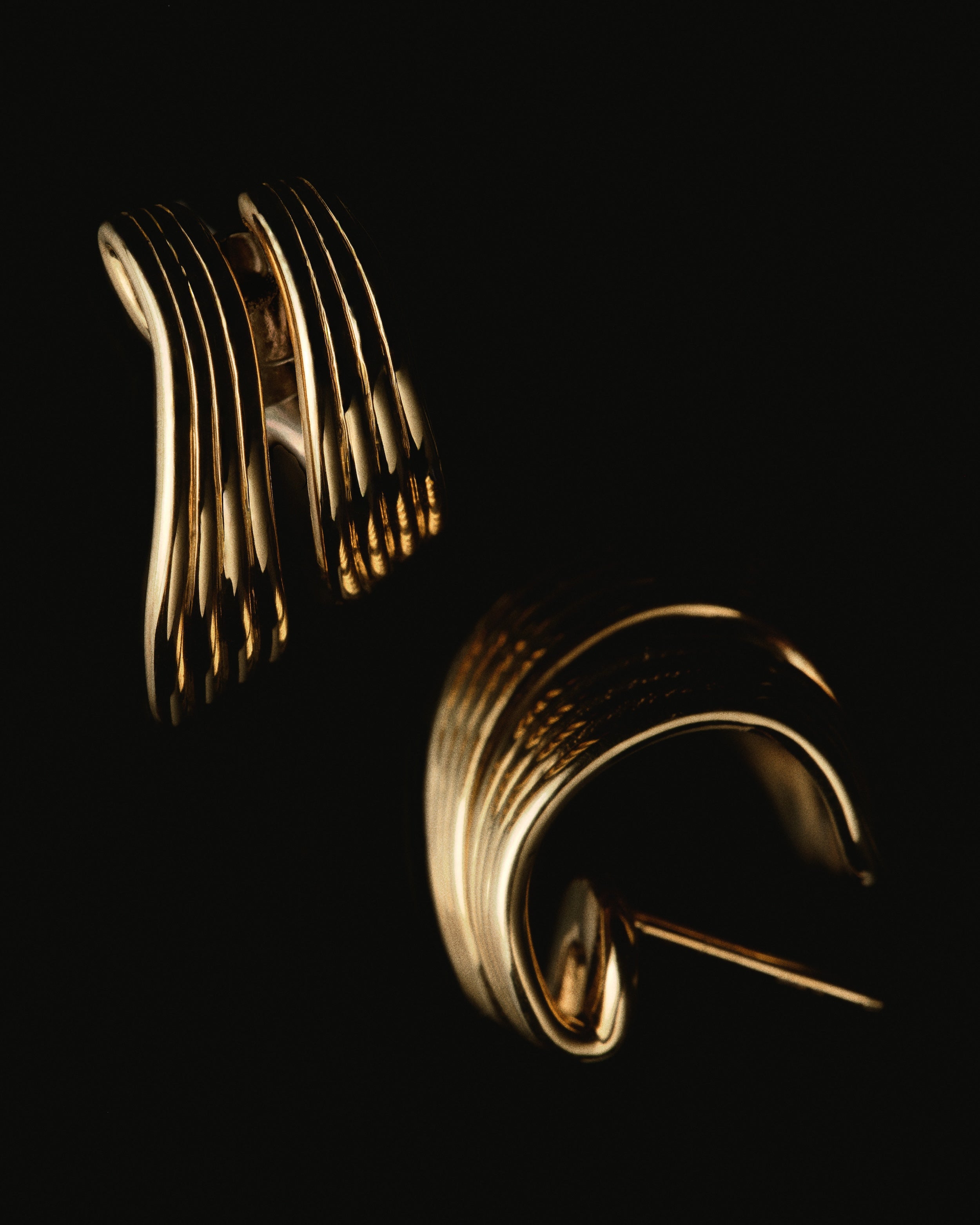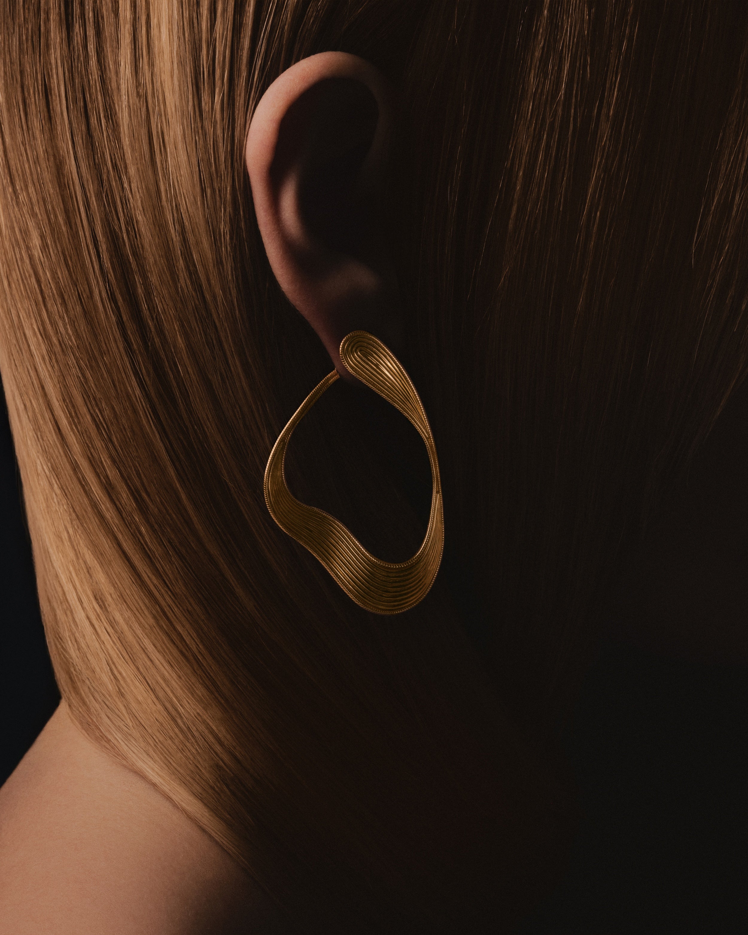 Above, moulded in waves of 18k yellow gold, the Stream Lines Open Earrings and Ring are precious metal alchemised into liquid form.