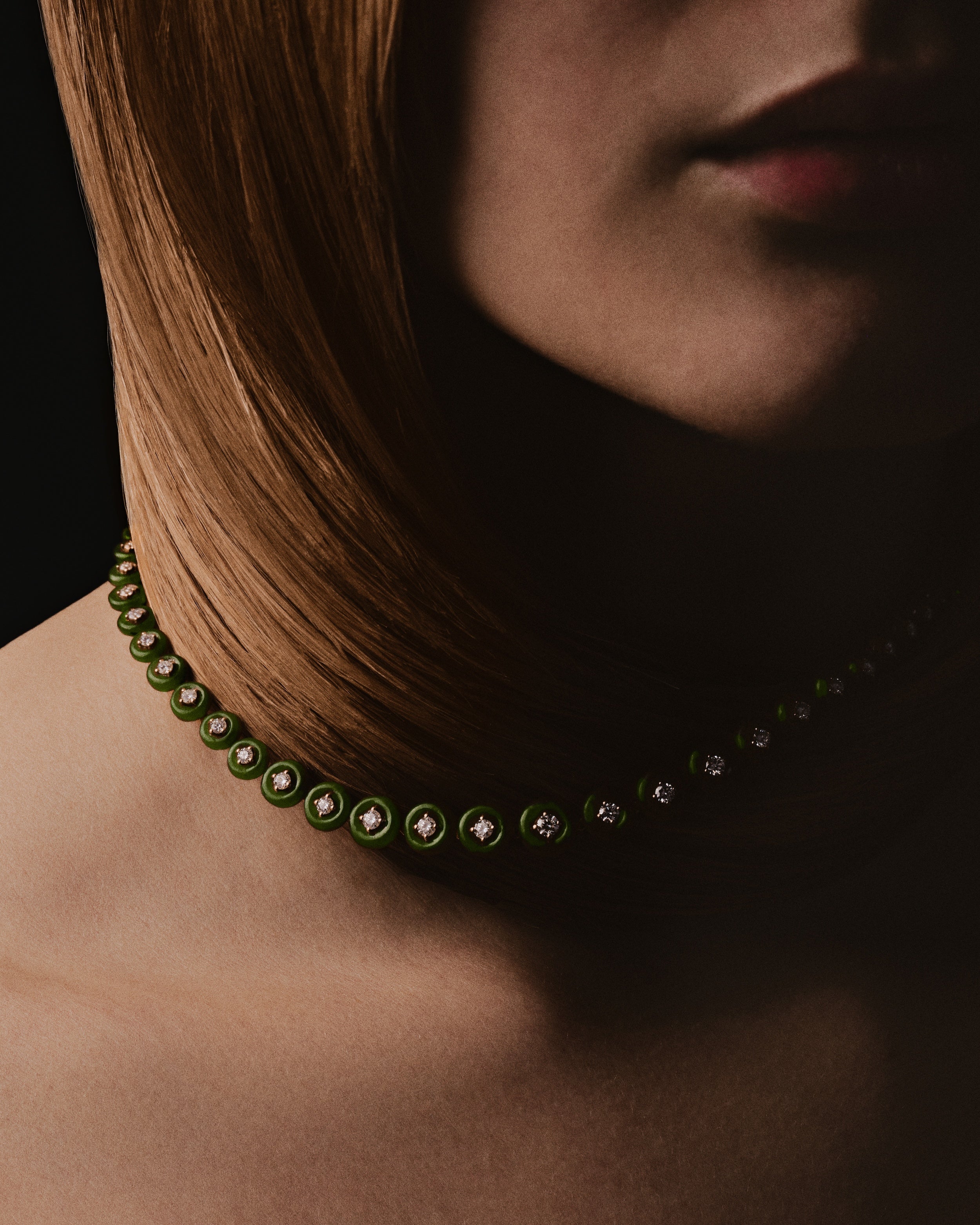 Surround balances the refined and luminous with the tactile and grounded. The Surrounding Small Necklace pairs 18k yellow gold and 2.28 carats of brilliant-cut diamonds with cool, hand-carved nephrite jade.
