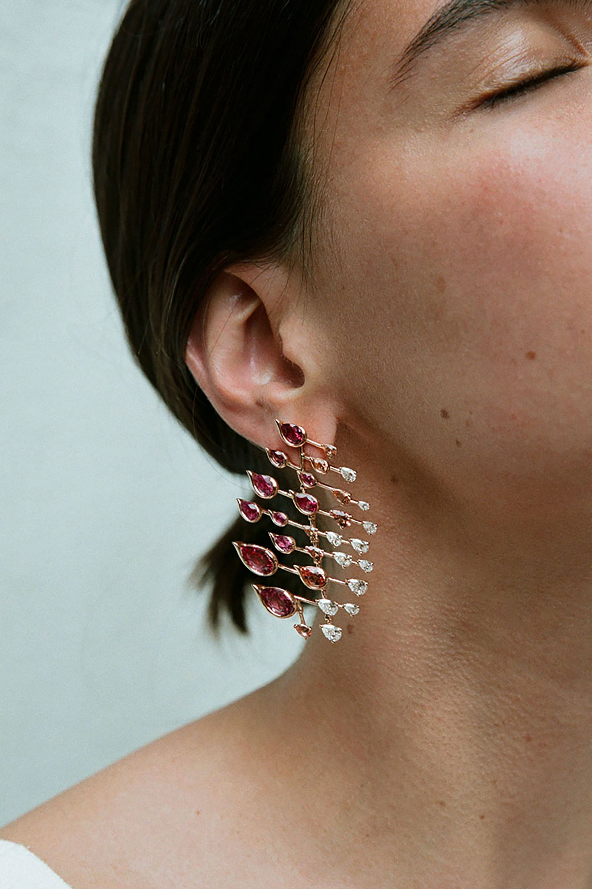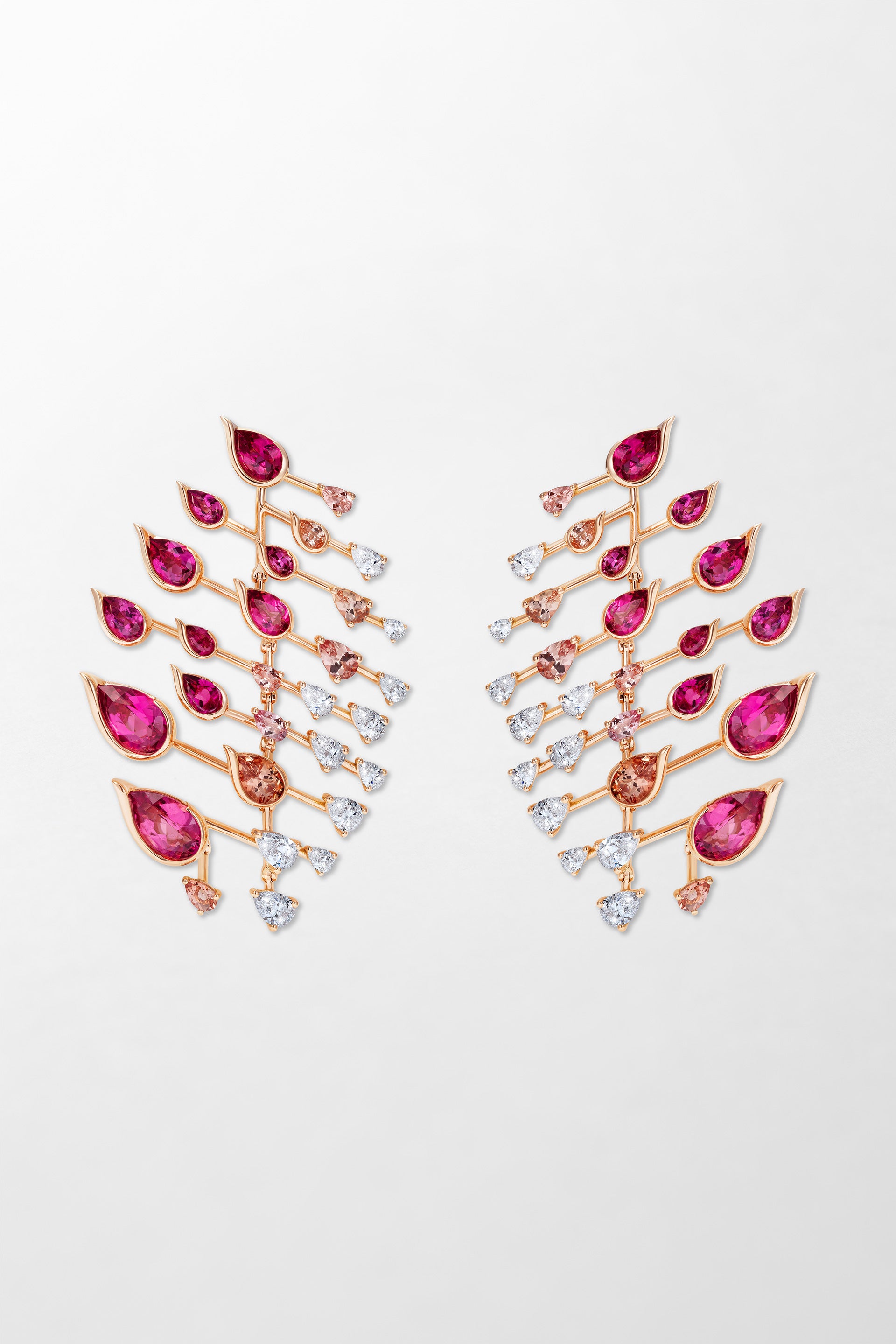 Crafted in 18k rose gold, set with pear cut Imperial Topaz, rubellite and 3.38 carat diamonds.