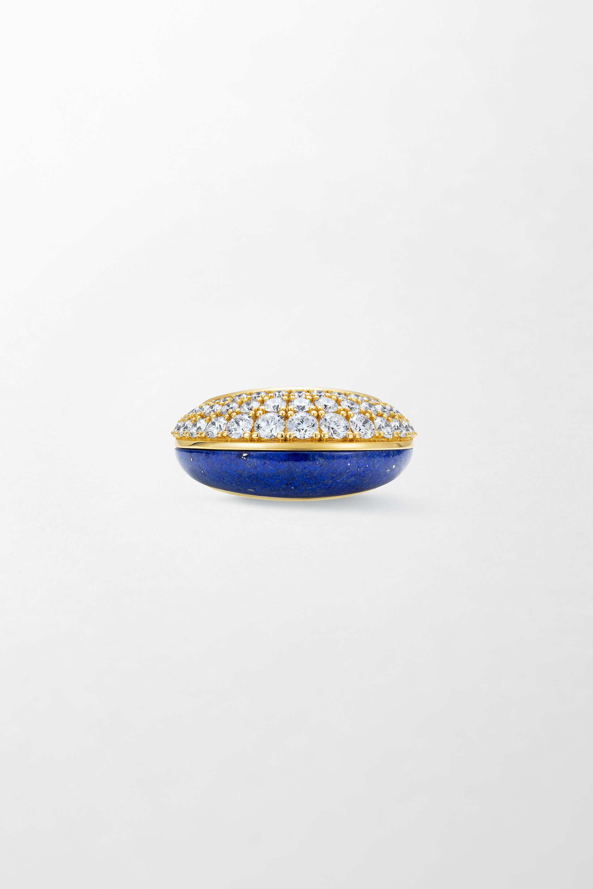 Crafted in 18k yellow gold and set with 1.84 carats of brilliant cut diamonds with hand-carved lapis lazuli.