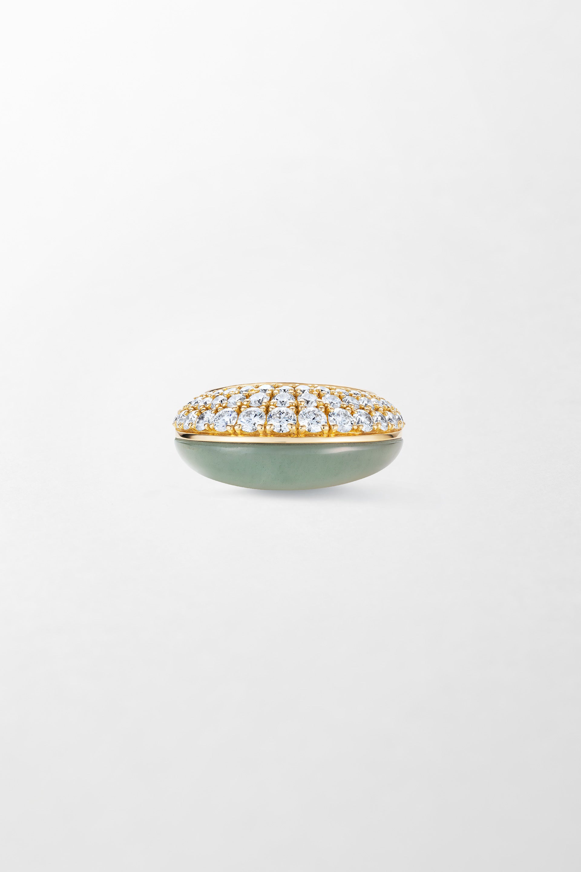 Crafted in 18k yellow gold and set with 1.84 carats of brilliant cut diamonds with hand-carved milky aquamarine.