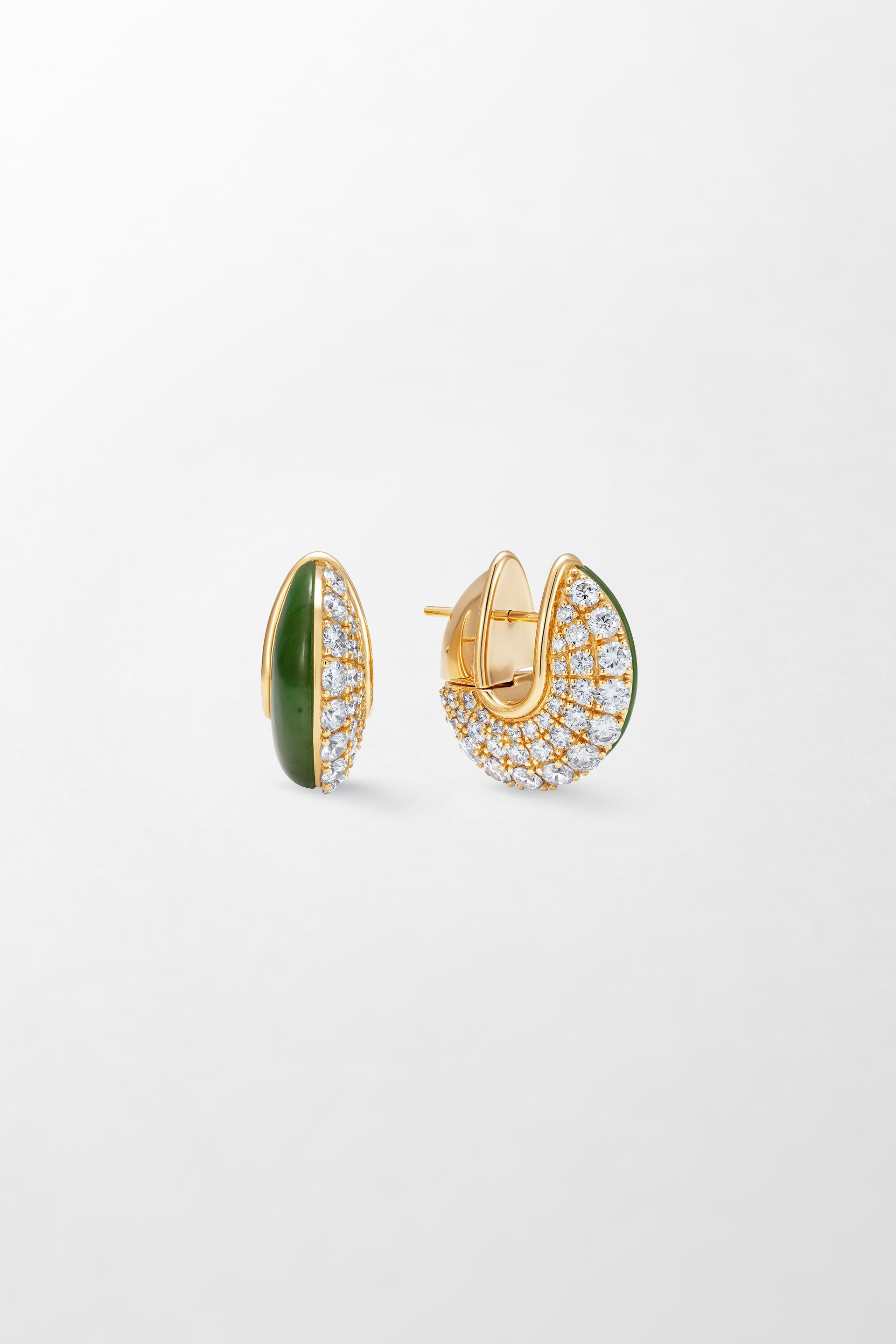 Crafted in 18k yellow gold and set with 2.8 carats of brilliant cut diamonds with hand-carved nephrite jade.