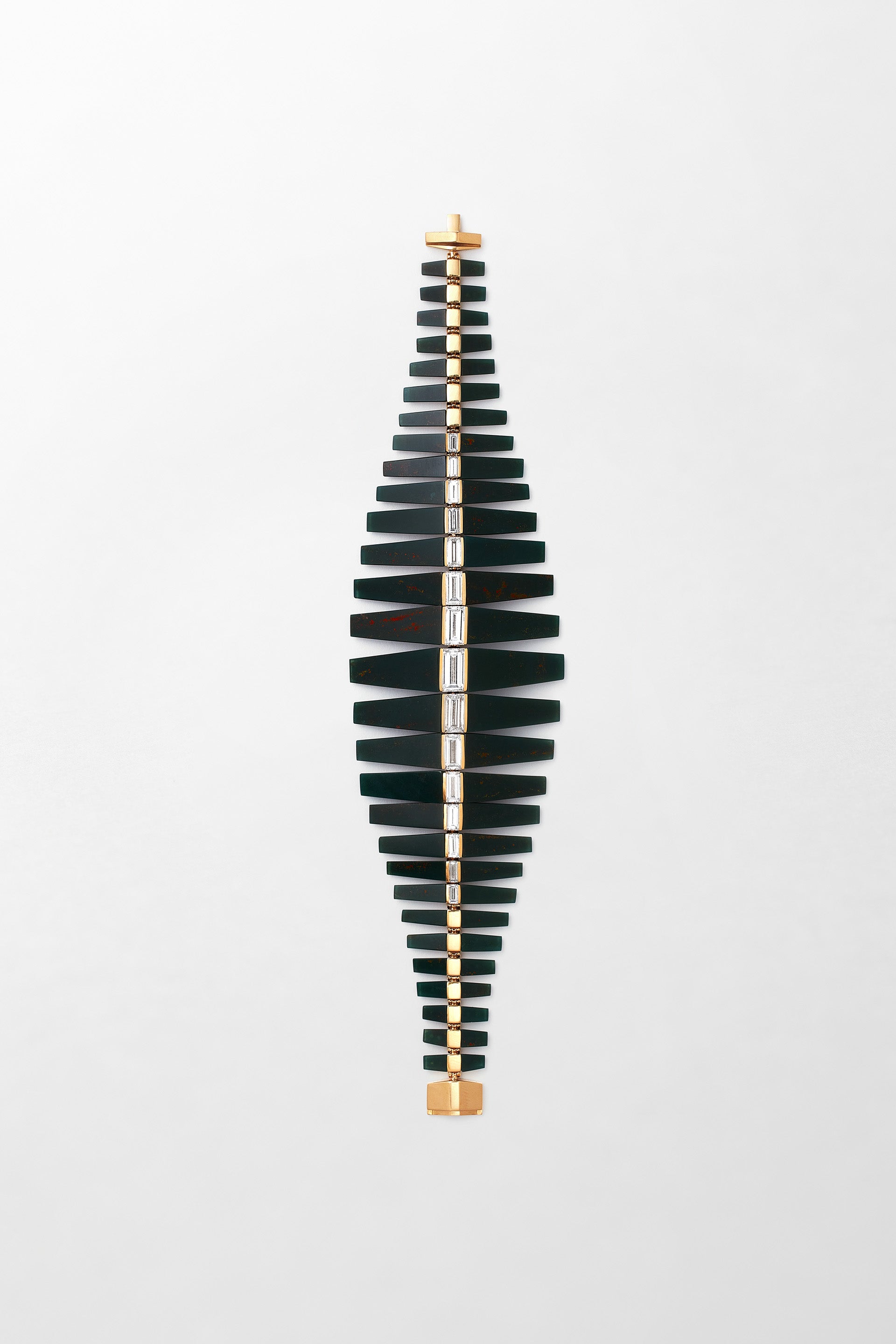 18k yellow gold, set with green jasper and 6.87 carats of baguette cut diamonds.