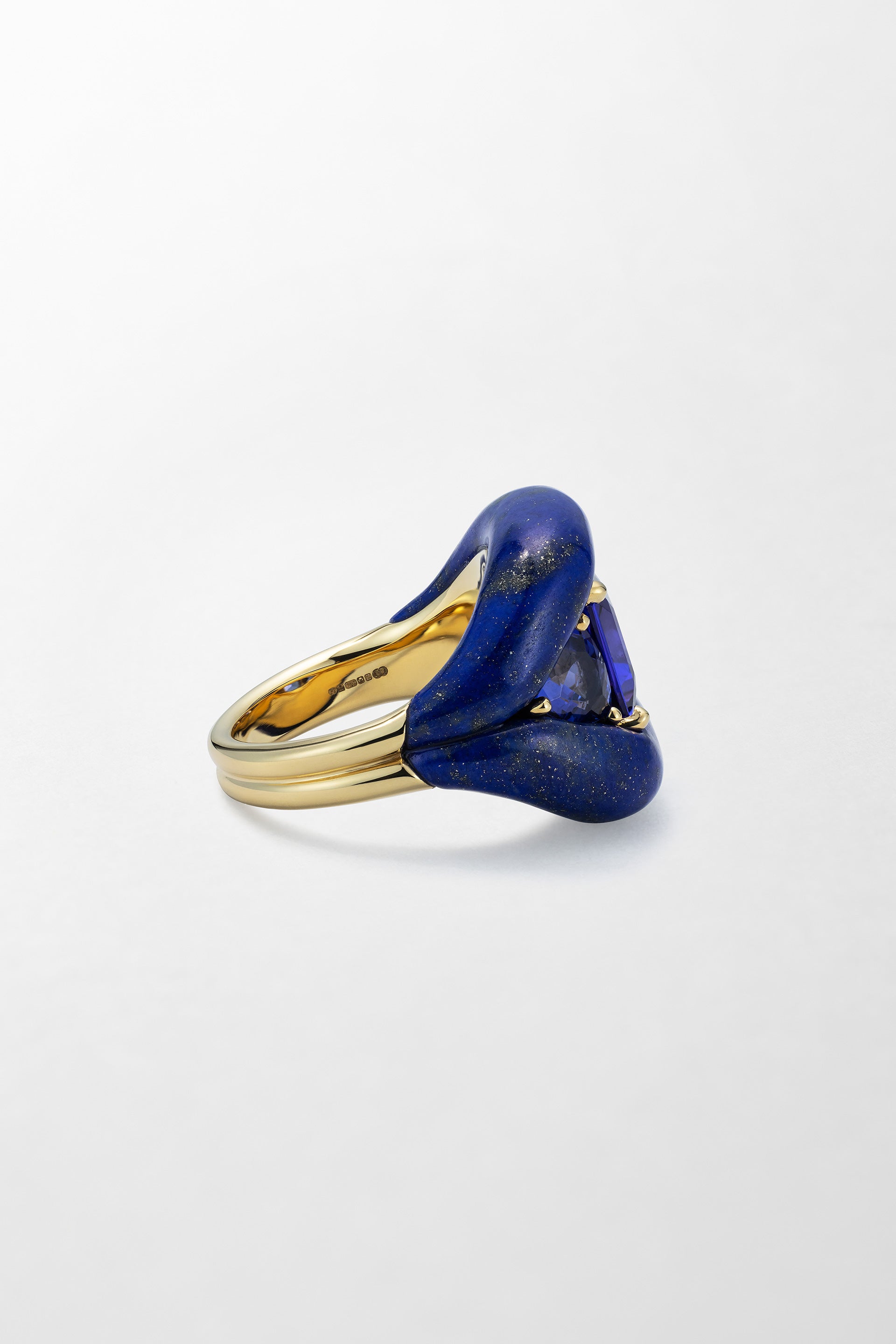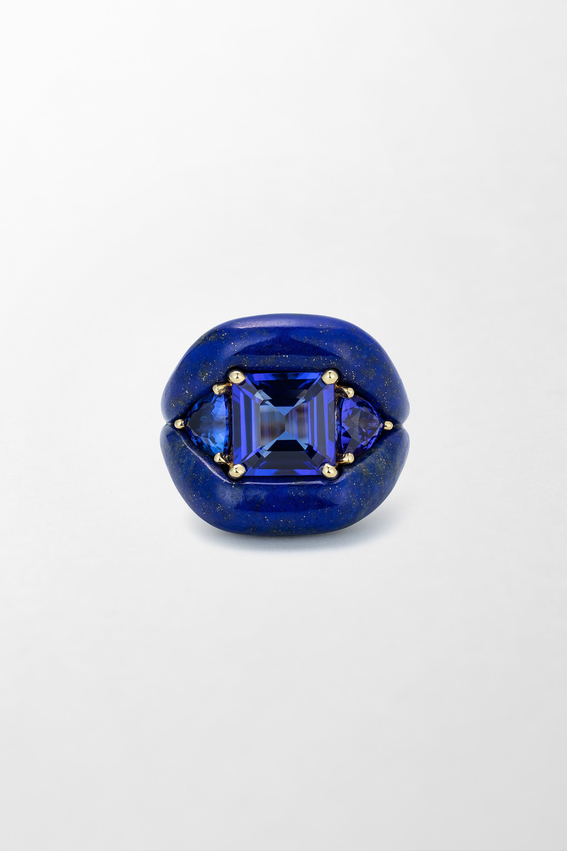 Crafted in 18k yellow gold and set with tanzanite and hand-carved lapis lazuli.