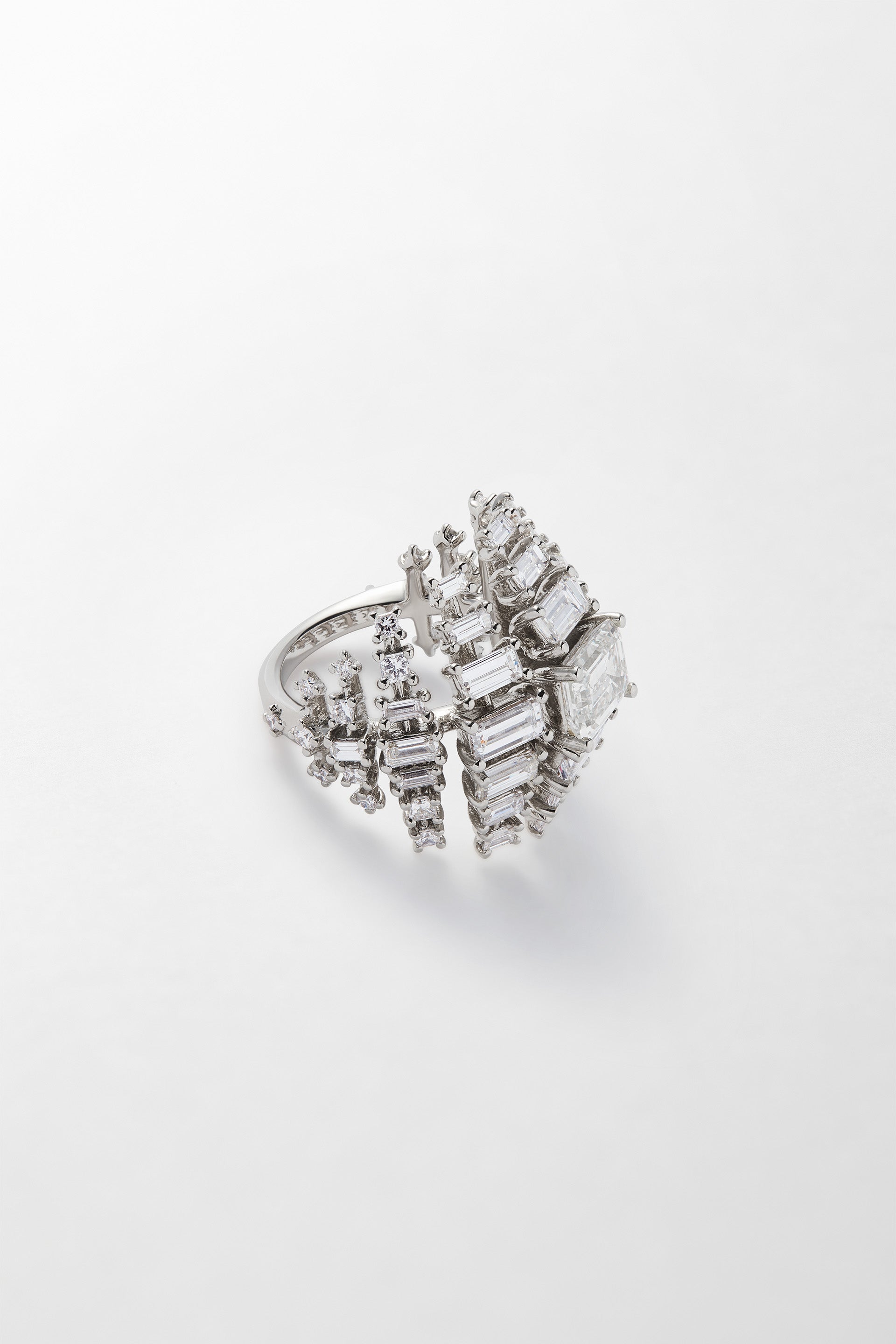 Platinum gold set with 6.72 carats of baguette diamonds and one emerald cut diamond.