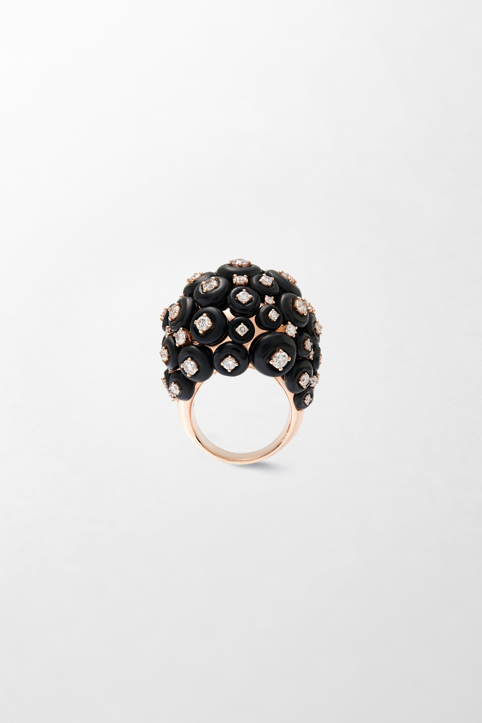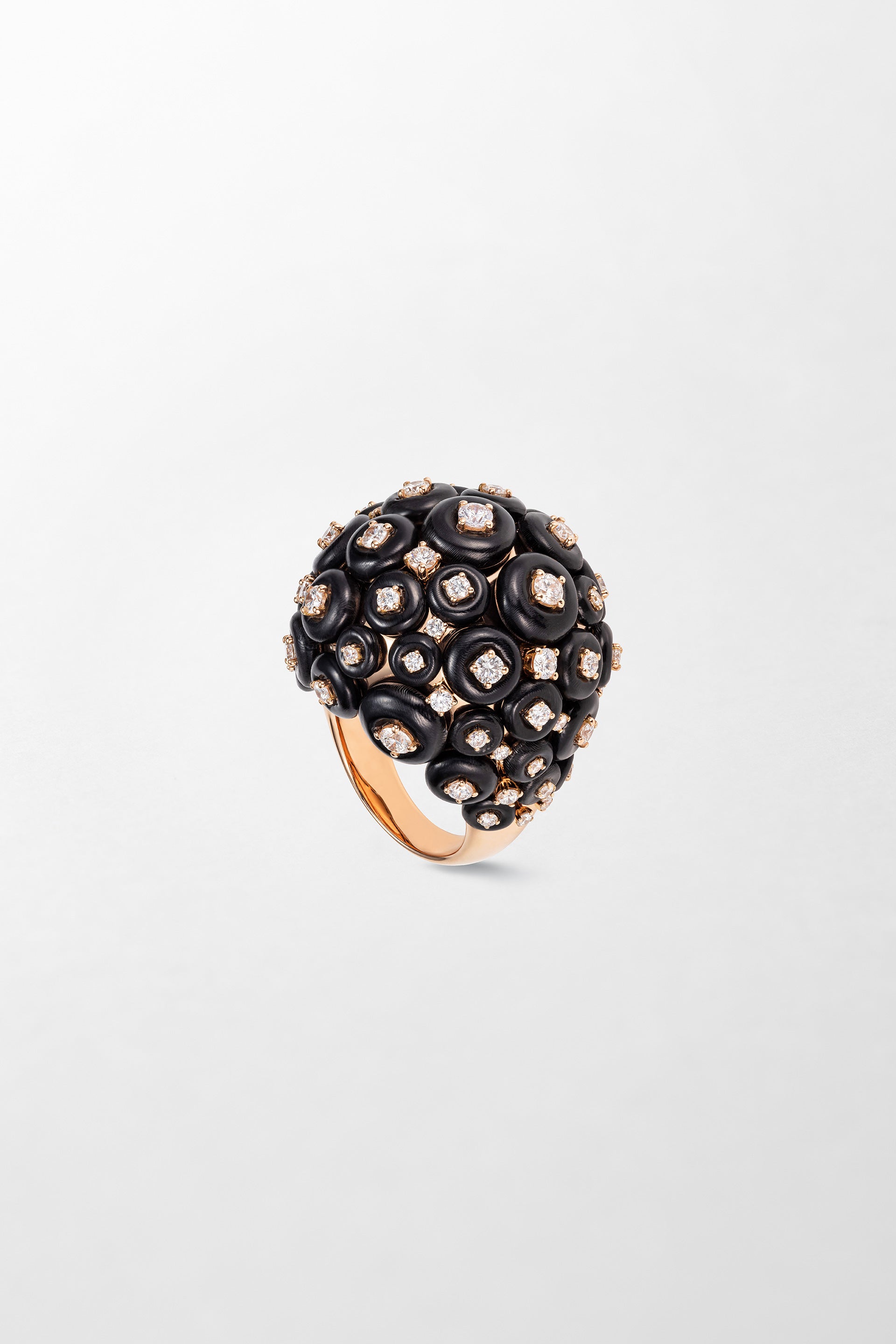 Crafted in 18k rose gold and set with 2.2 carats of brilliant cut diamonds and hand-carved horn.