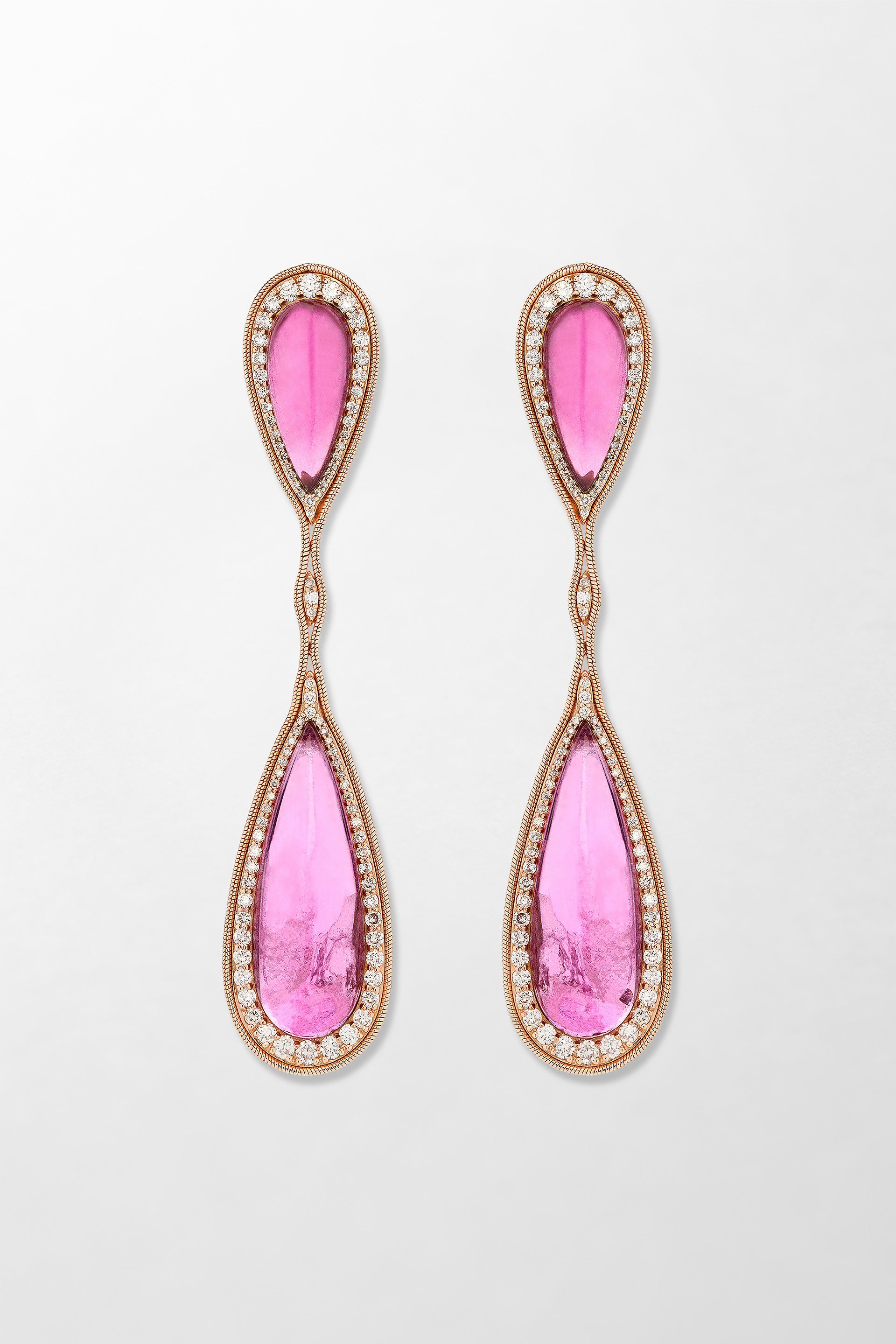 Crafted in 18k rose gold and set with 3.19 carats of brilliant cut diamonds and hand-carved rubellite.