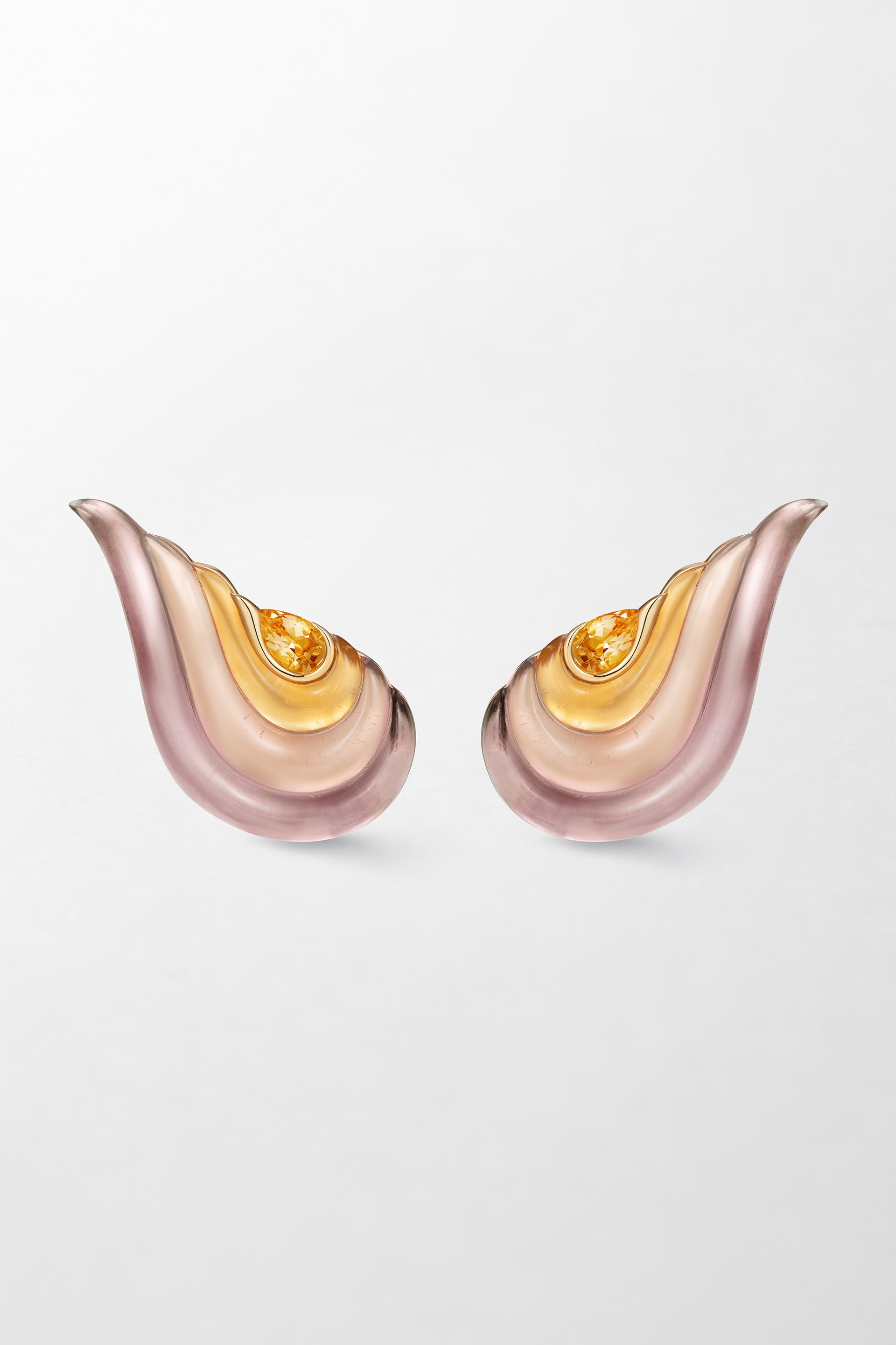 Crafted in 18k yellow gold and set with hand-carved citrine, rose quartz and amethyst.