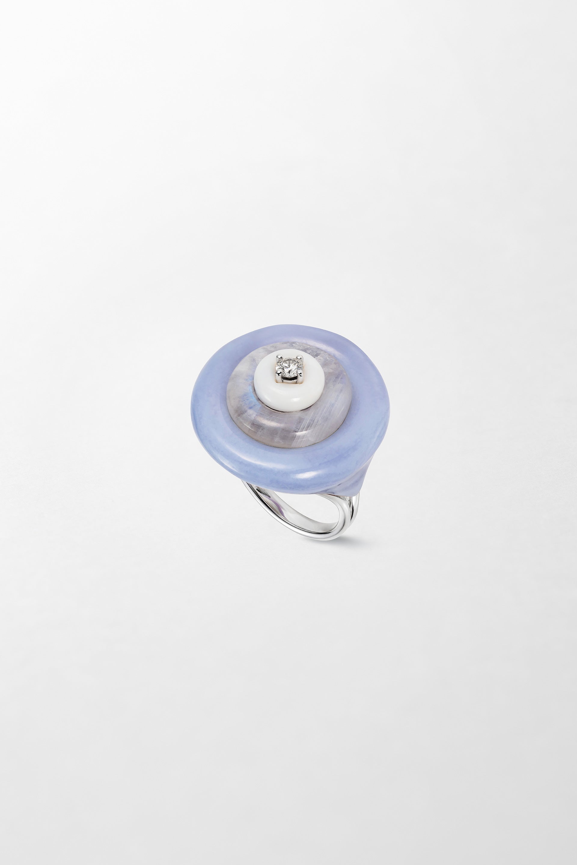 Crafted in 18k white gold, set with 0.13 carats of brilliant cut diamonds and hand-carved chalcedony, moonstone and white opal.