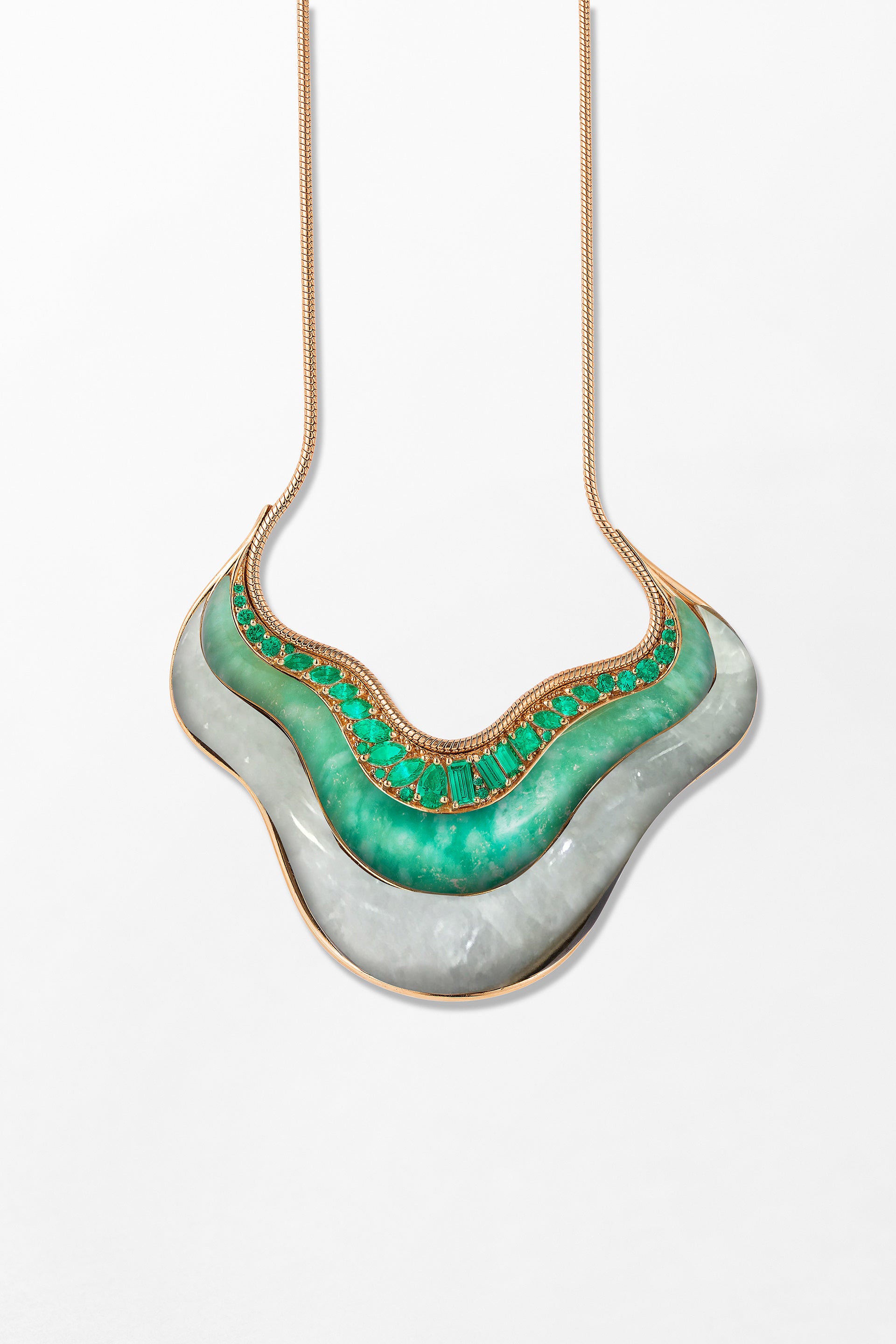 Crafted in 18k rose gold, set with emeralds and hand-carve milky aquamarine and amazonite.