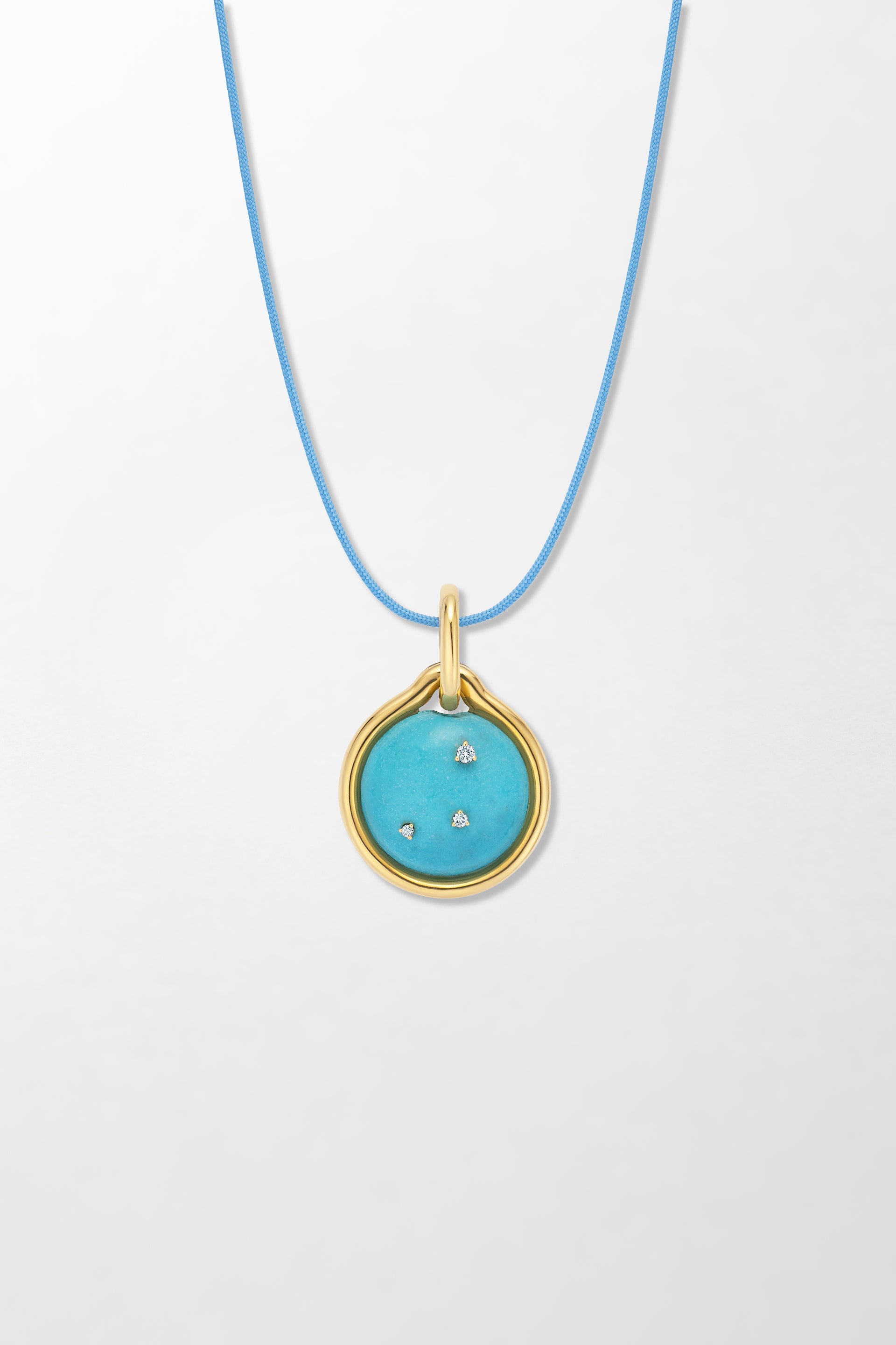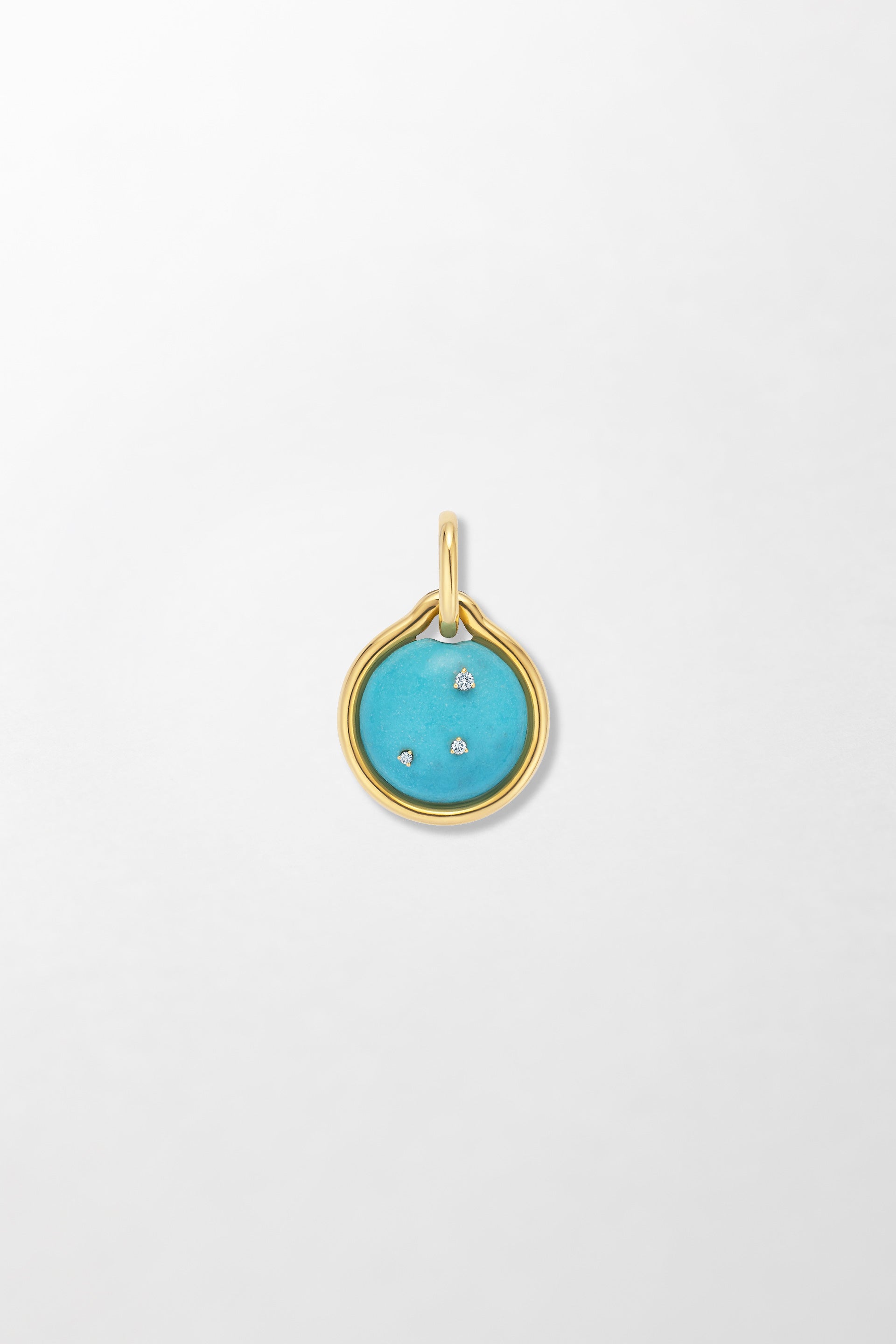 Crafted in 18k yellow gold set with brilliant cut diamonds and hand-carved turquoise.