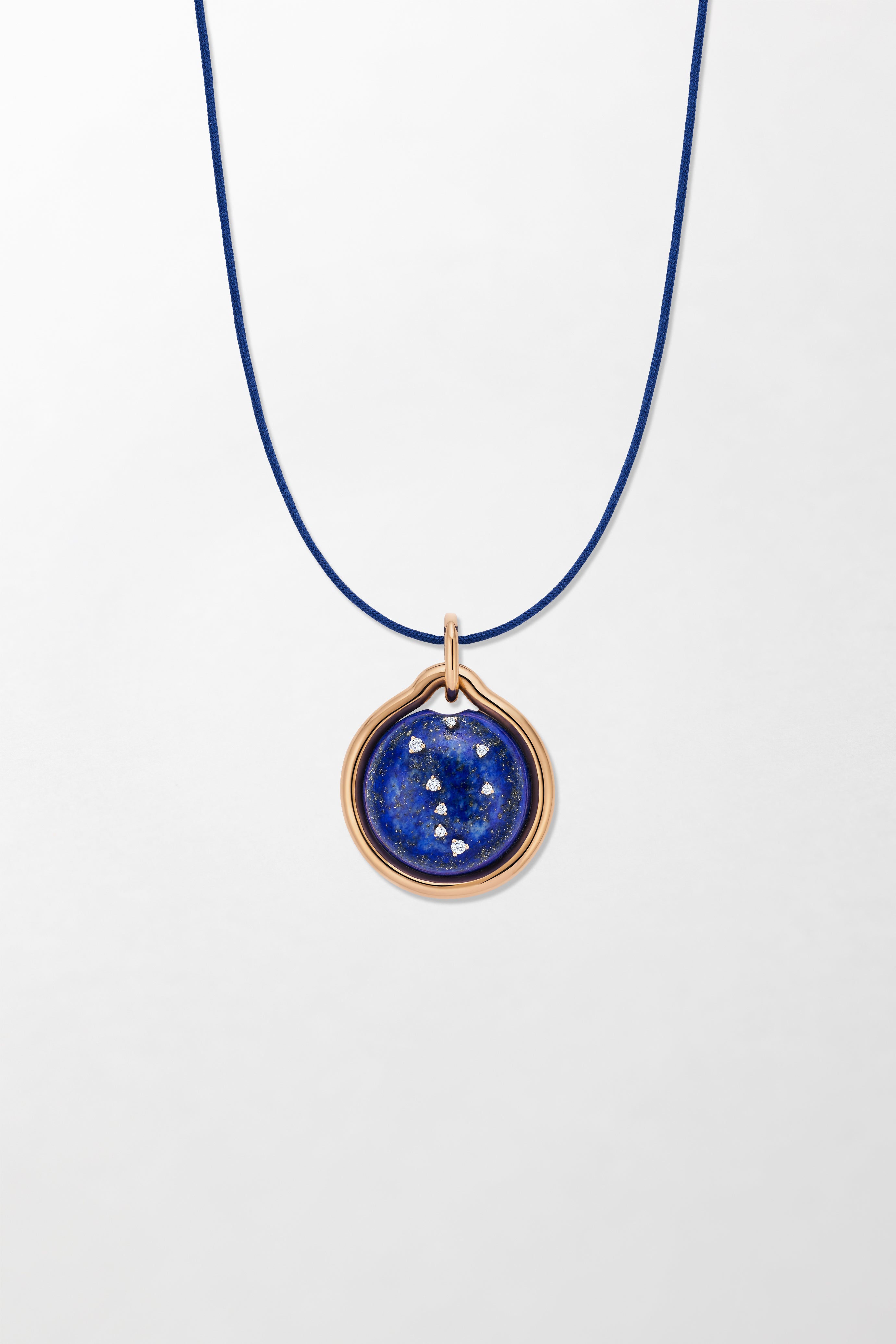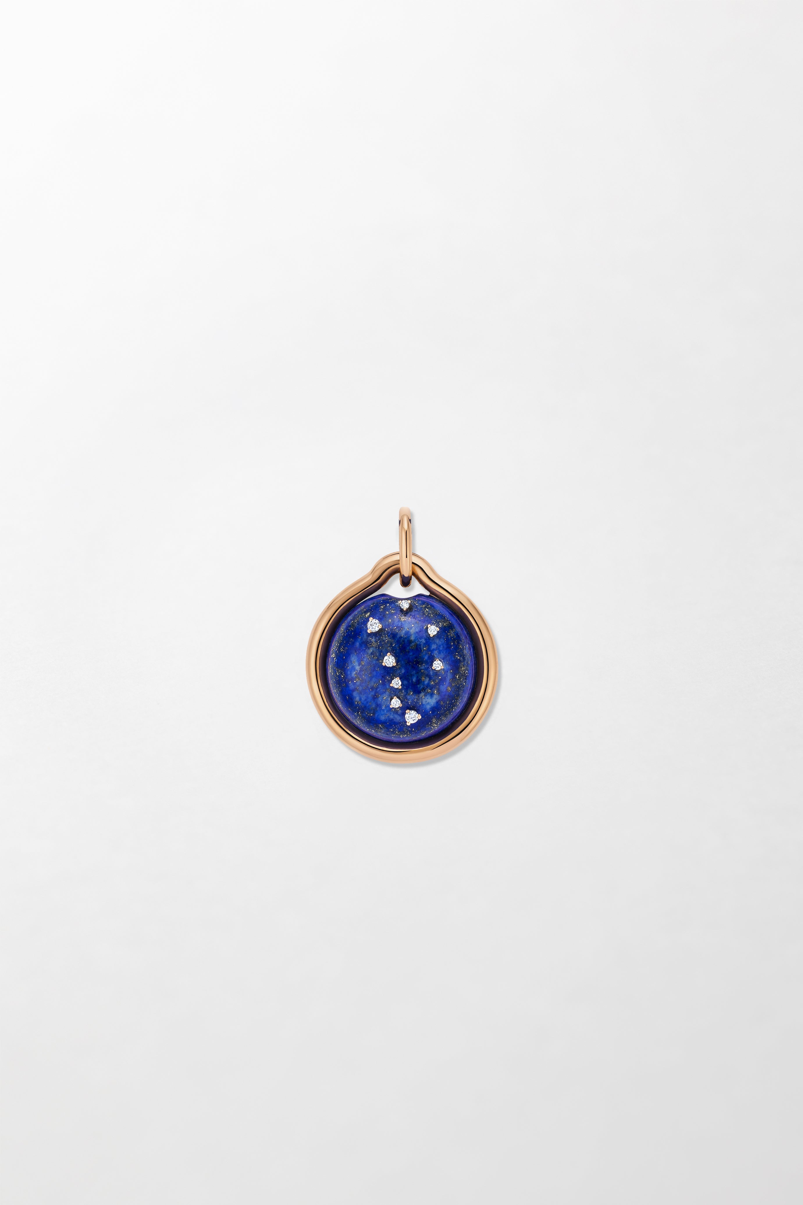 Crafted in 18k rose gold and set with brilliant cut diamonds with hand-carved lapis lazuli.