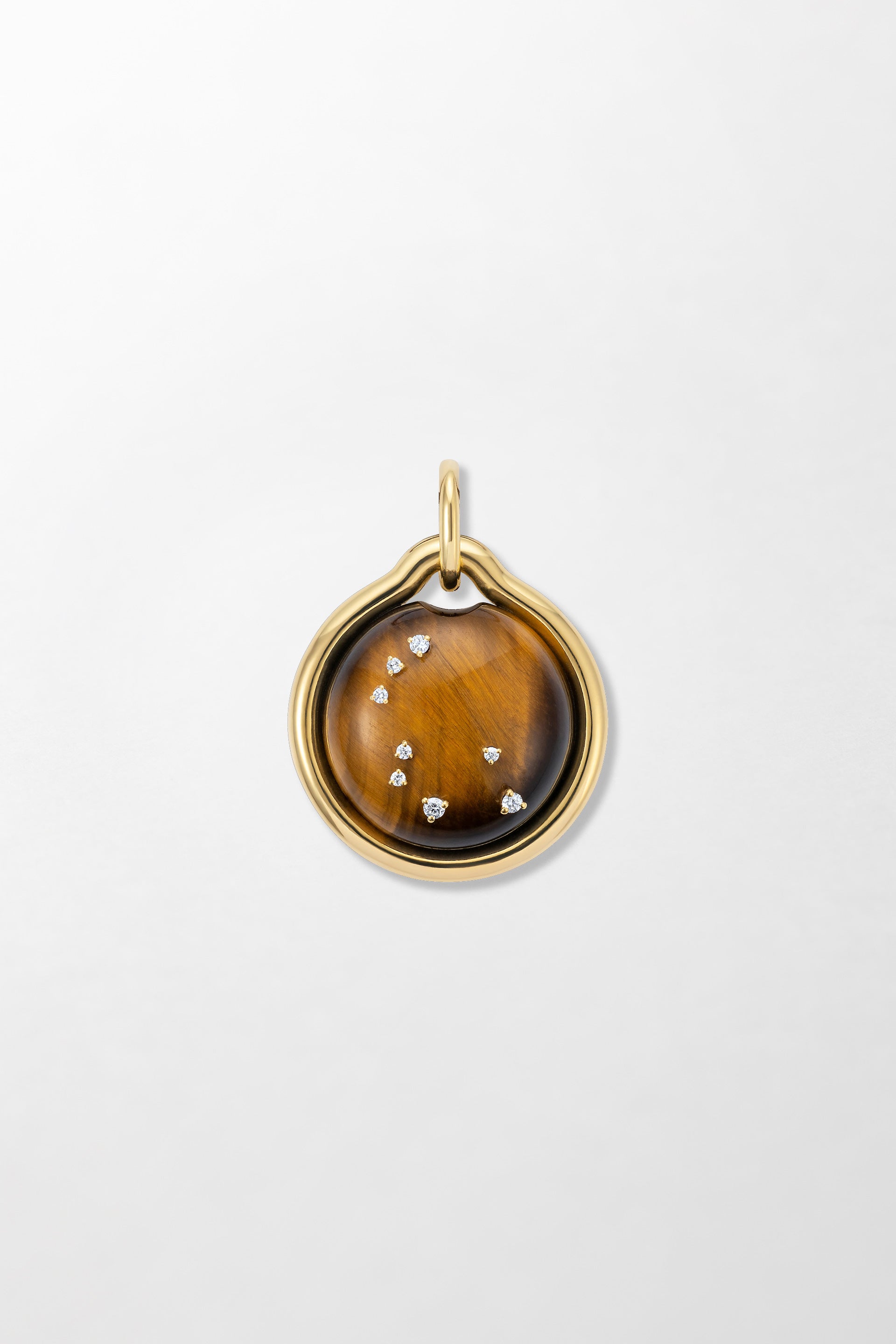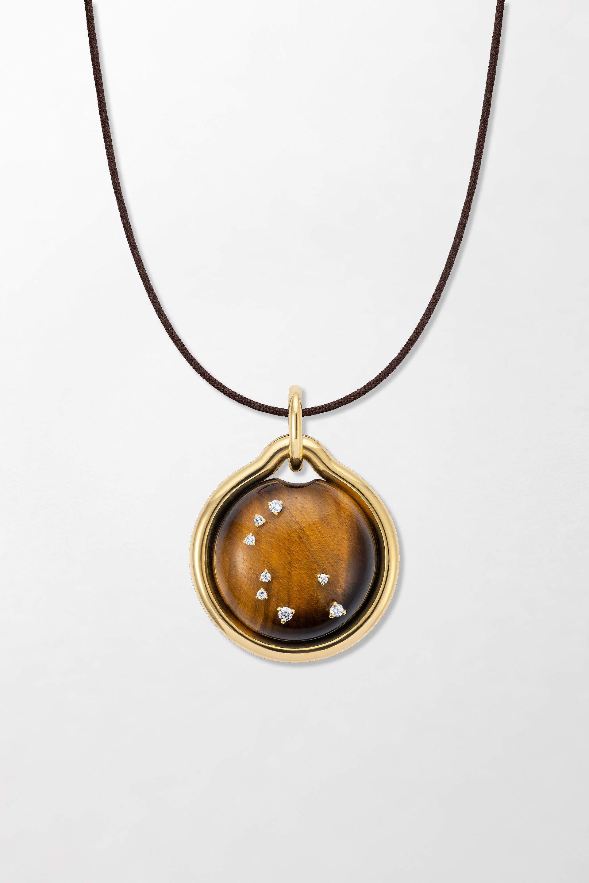 Crafted in 18k yellow gold, set with brilliant cut diamonds and hand-carved tiger eye. Cord included with 18k yellow gold clasp.