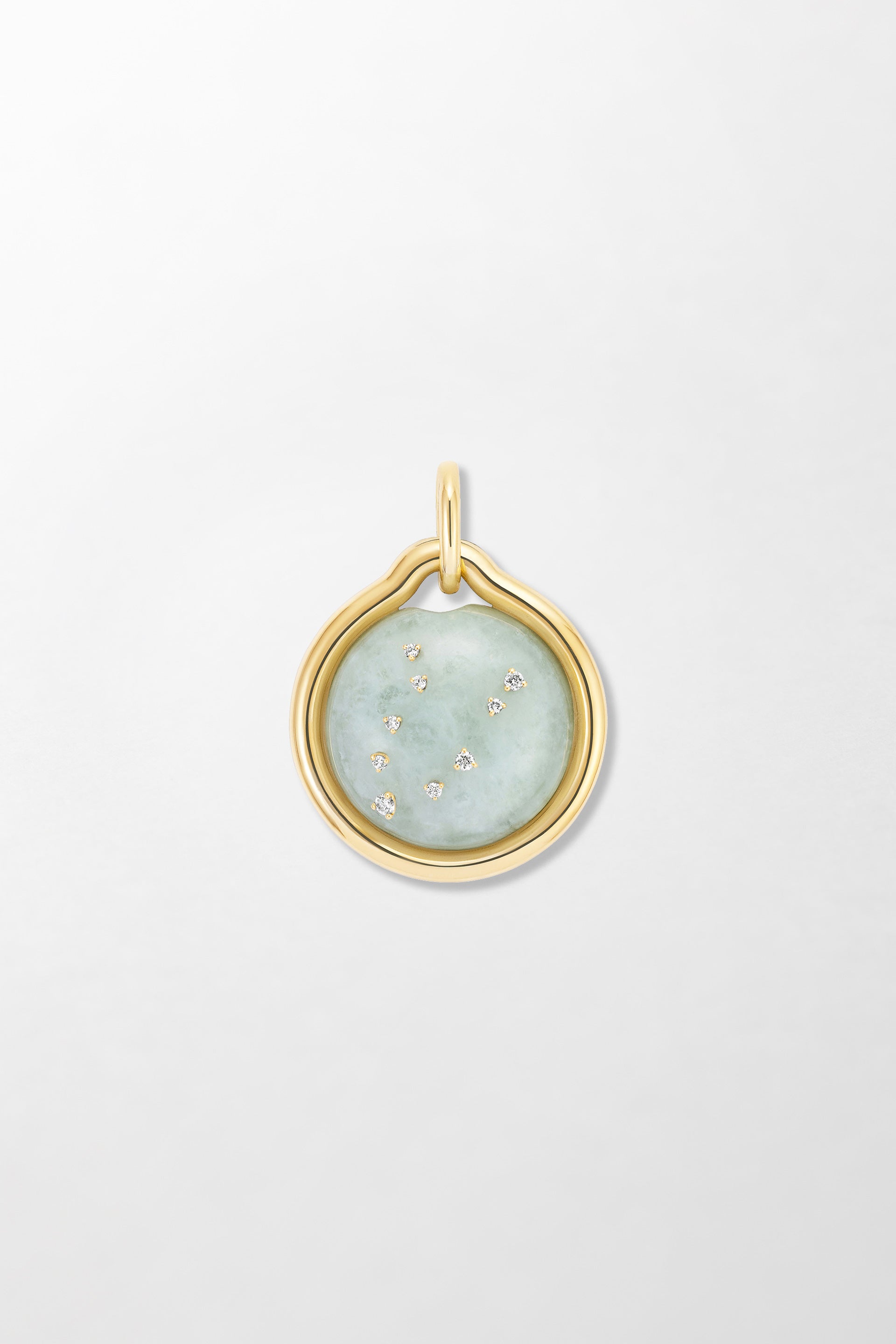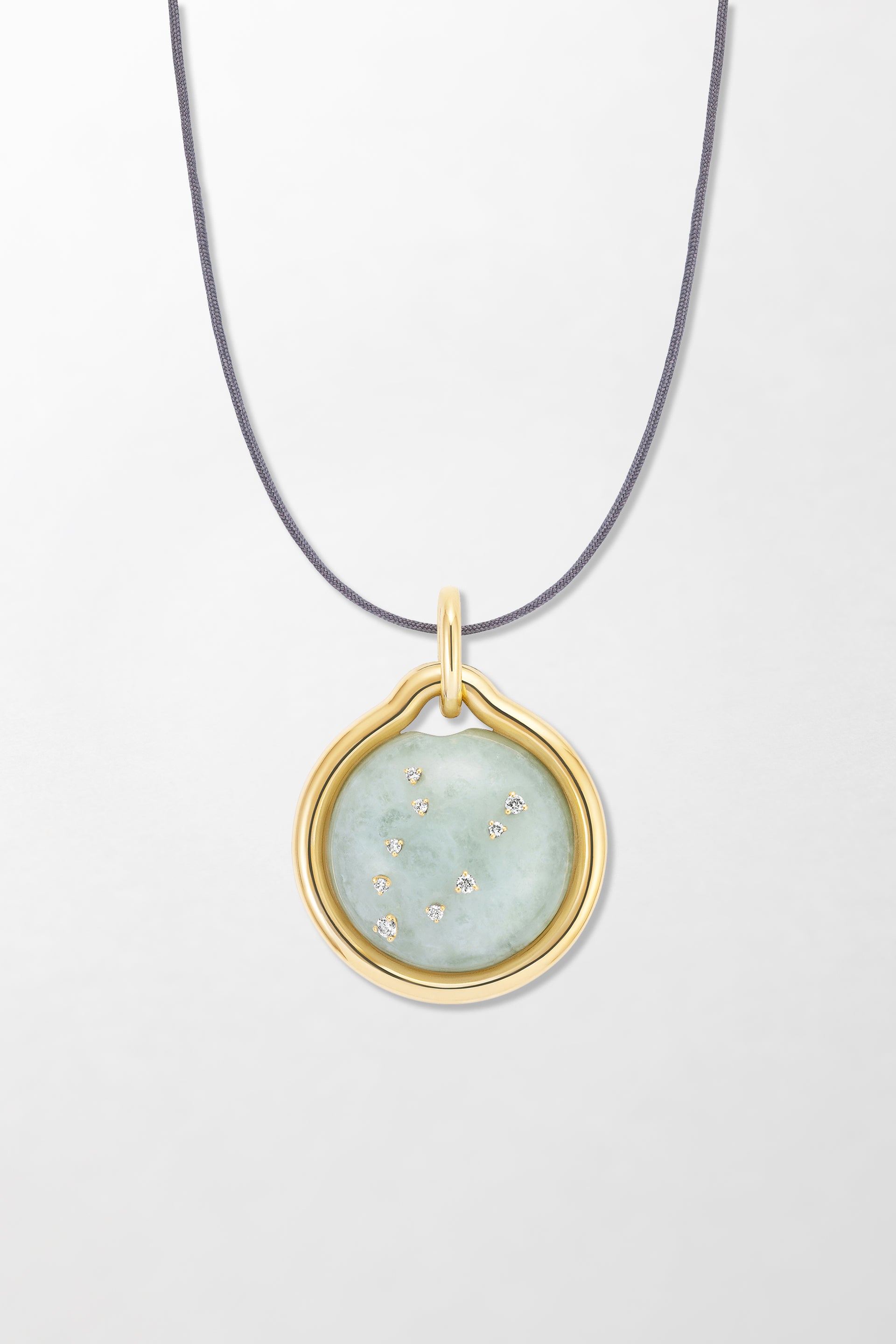 Crafted in 18k yellow gold and set with brilliant cut diamonds with hand-carved milky aquamarine. Cord included with 18k yellow gold clasp.