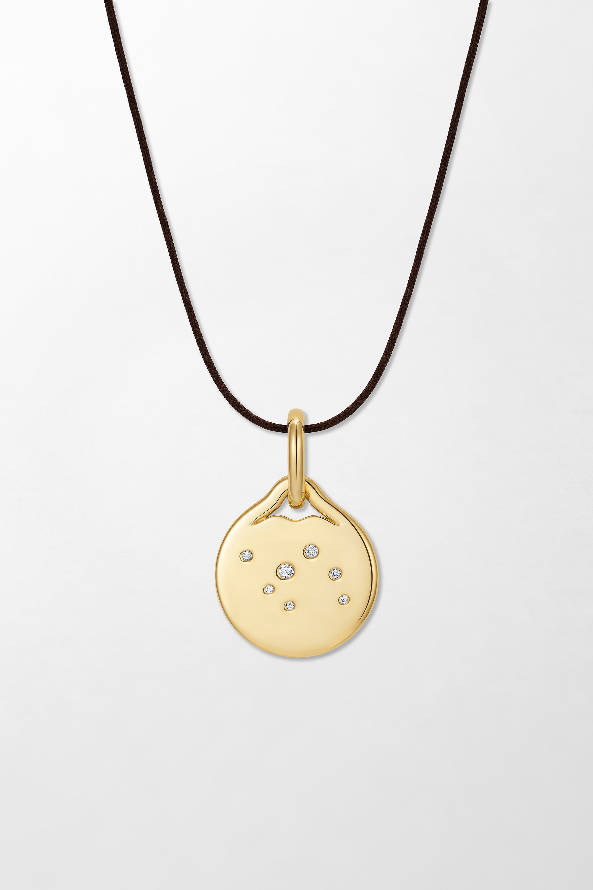 Crafted in 18k yellow gold and set with brilliant cut diamonds. Cord included with 18k yellow gold clasp.