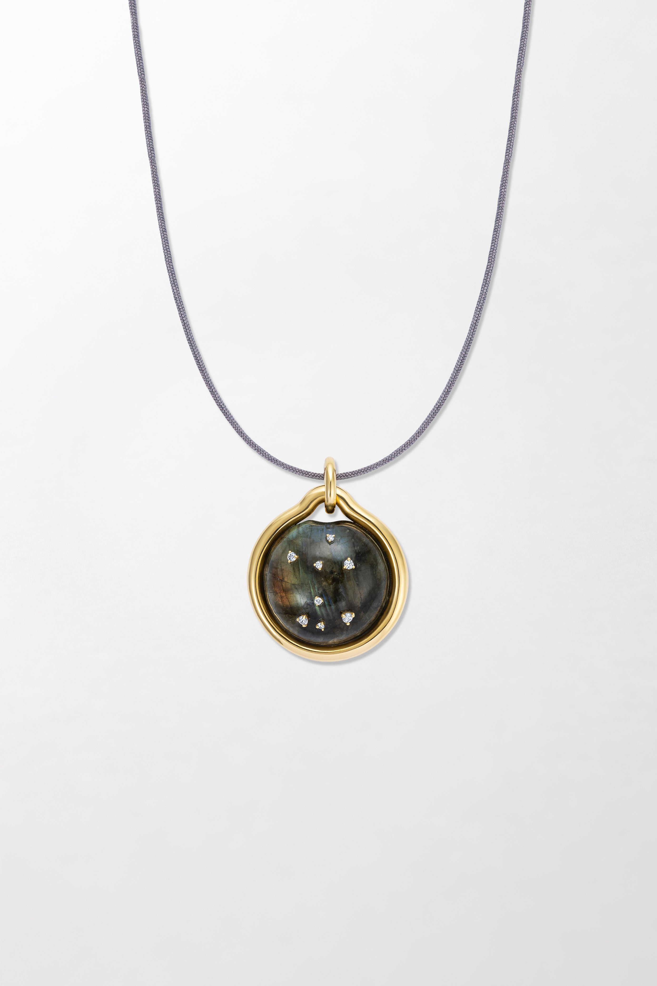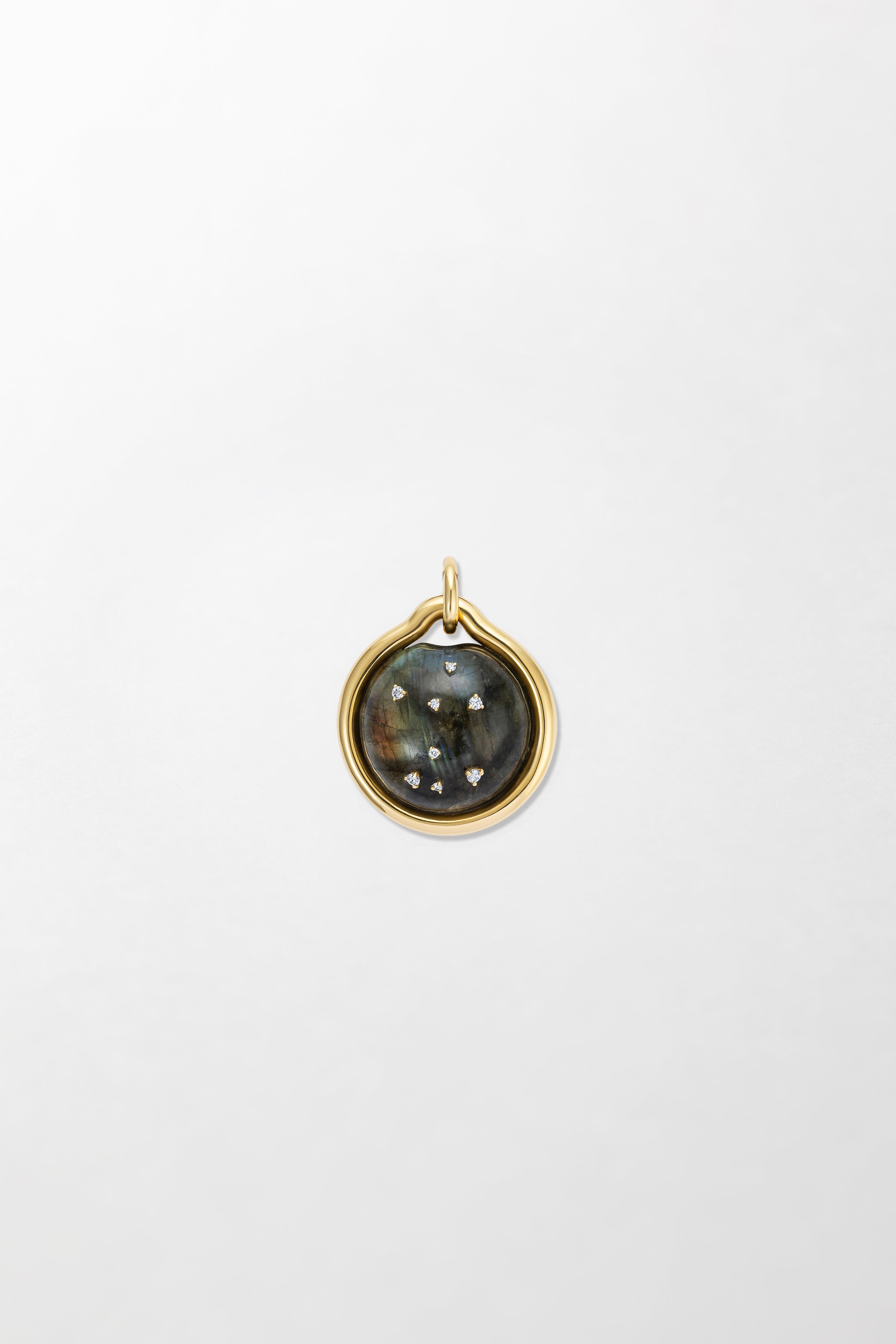 Crafted in 18k yellow gold and set with brilliant cut diamonds with hand-carved labradorite.