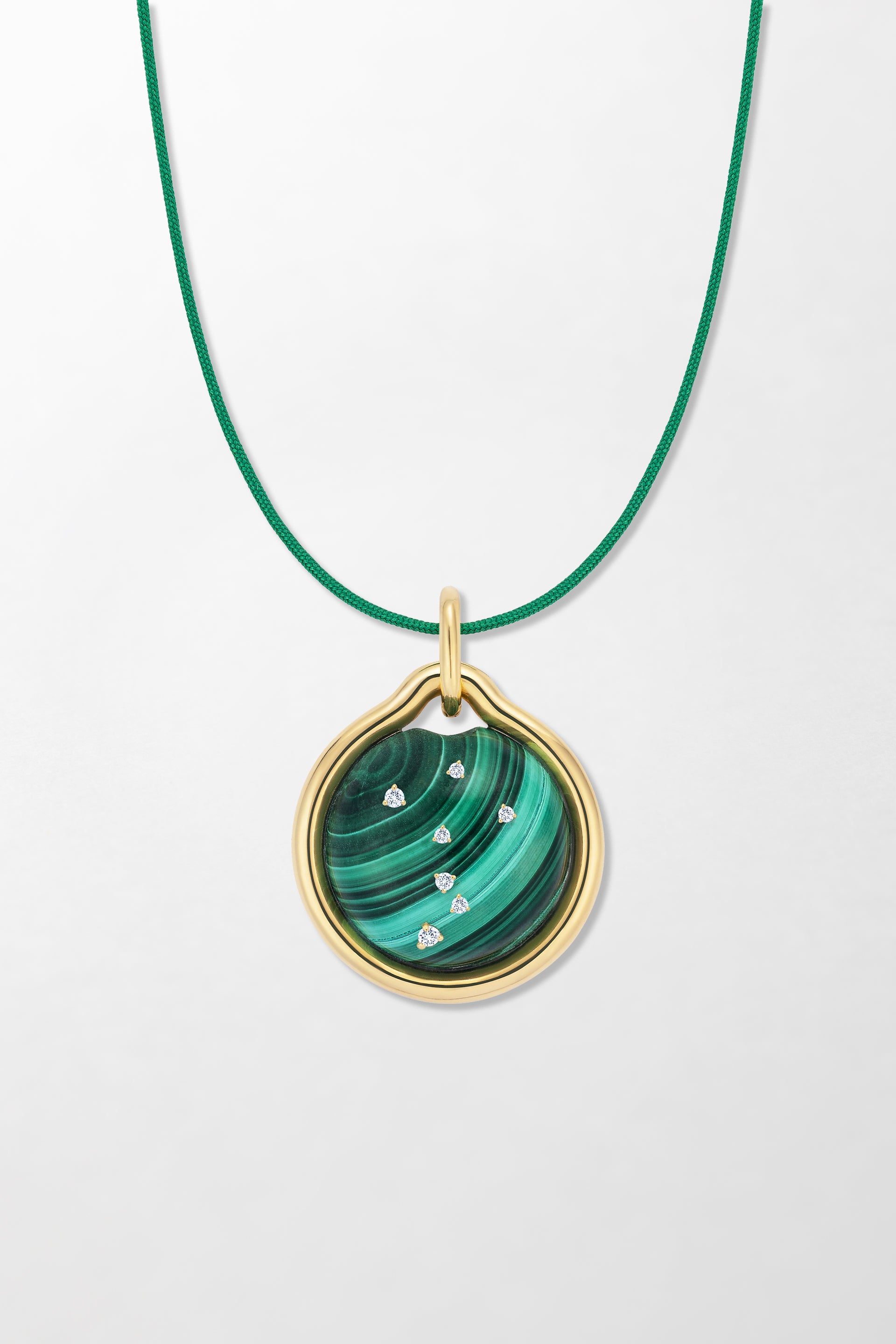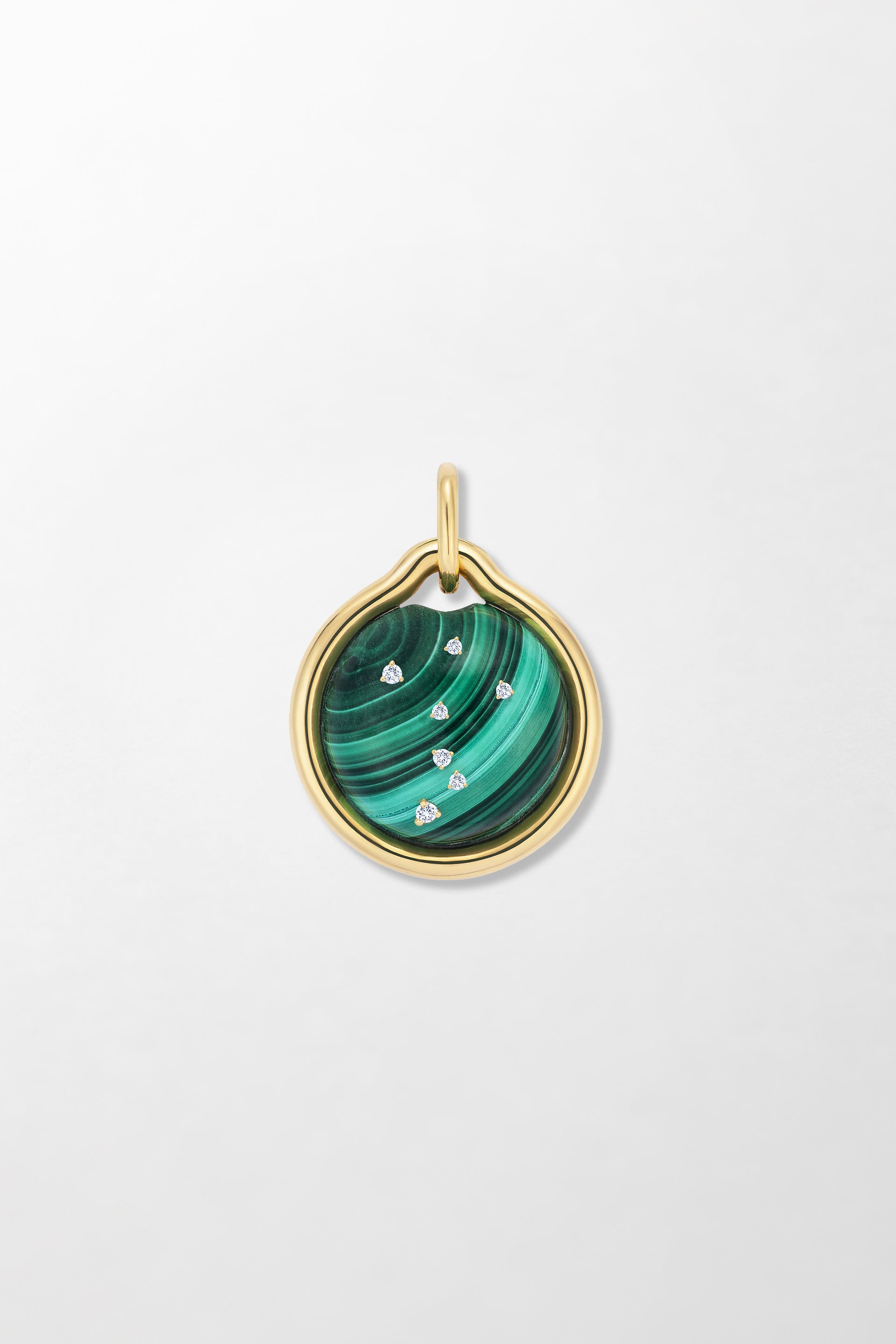 Crafted in 18k yellow gold diamonds set with brilliant cut diamonds with hand-carved malachite.