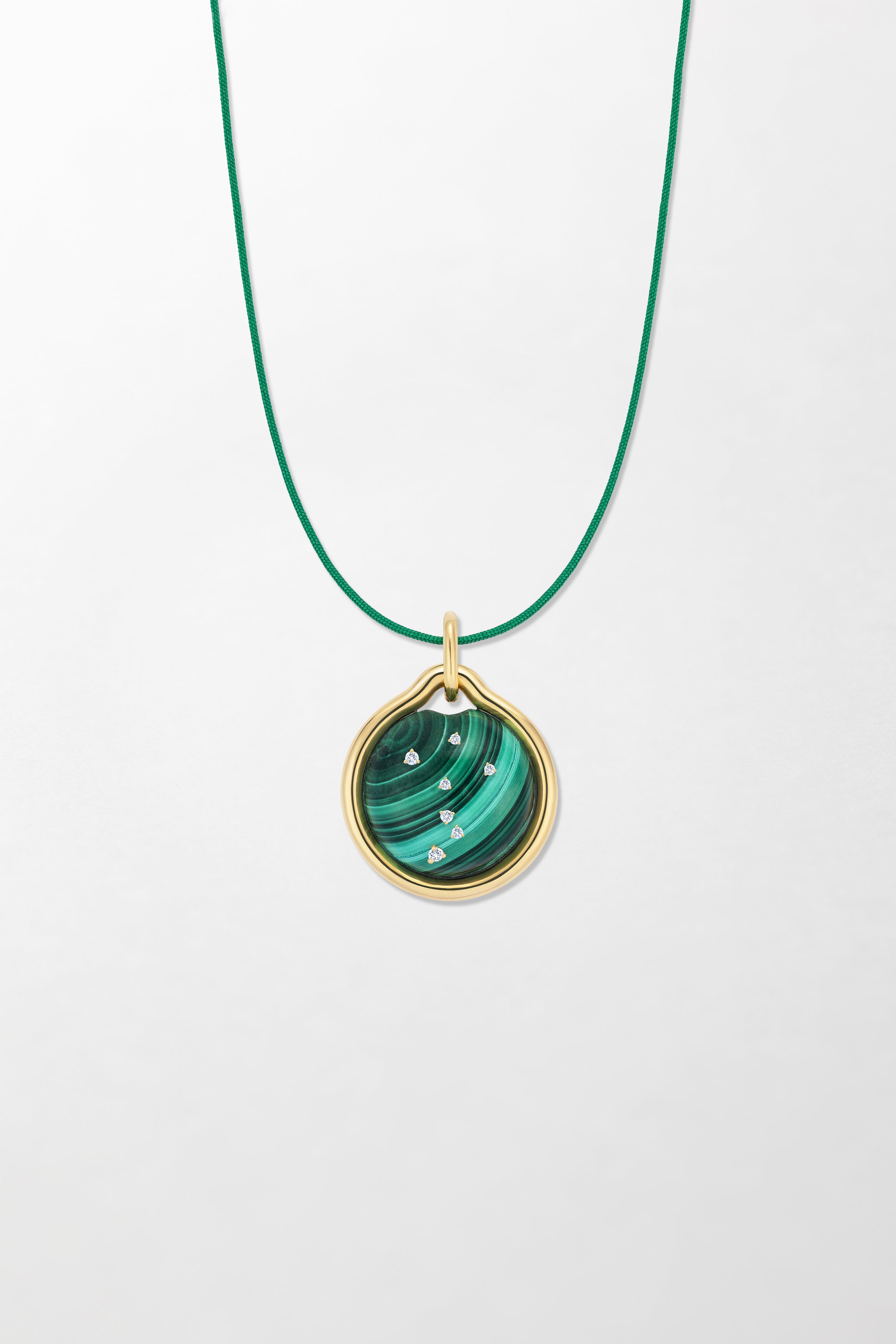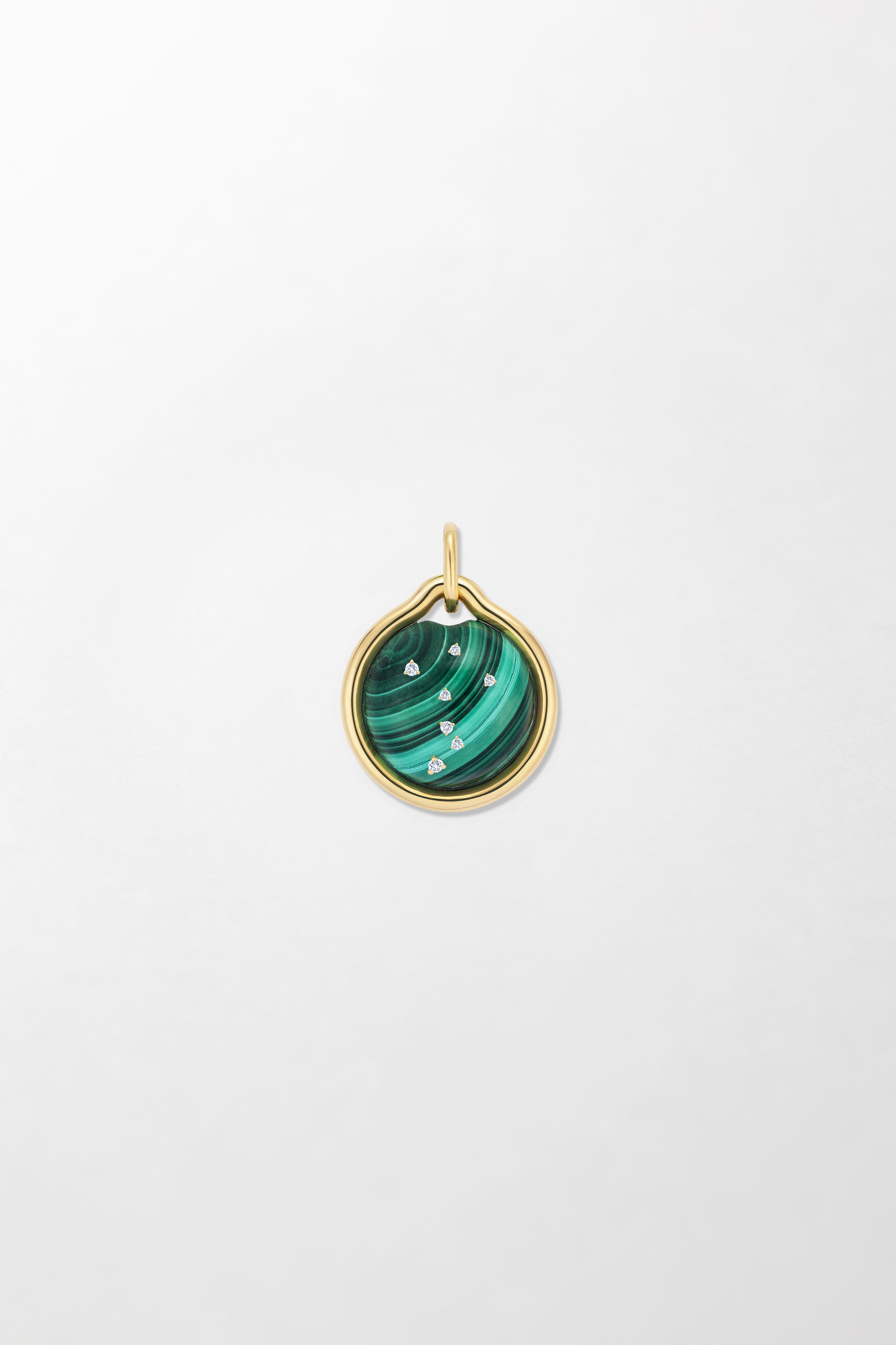 Crafted in 18k yellow gold diamonds set with brilliant cut diamonds with hand-carved malachite.