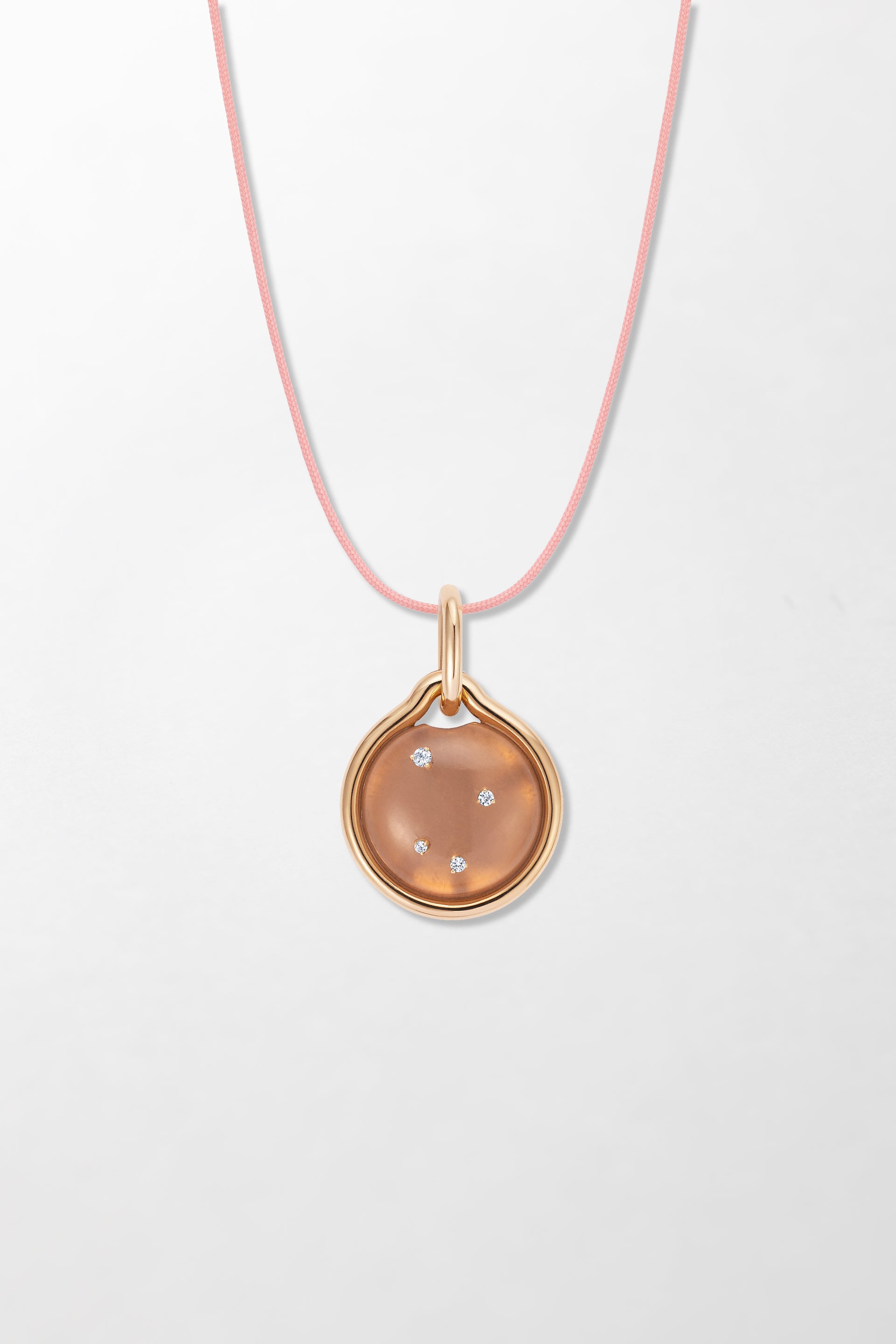 Crafted in 18k rose gold and set with brilliant cut diamonds with hand-carved pink quartz. Cord included with 18k yellow gold clasp.