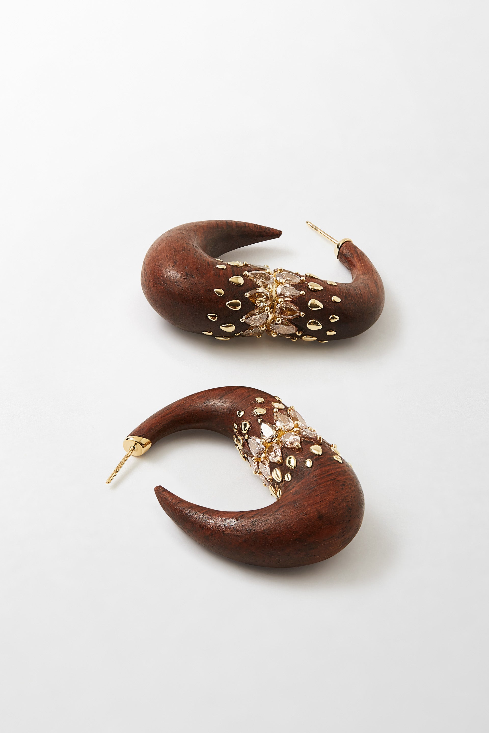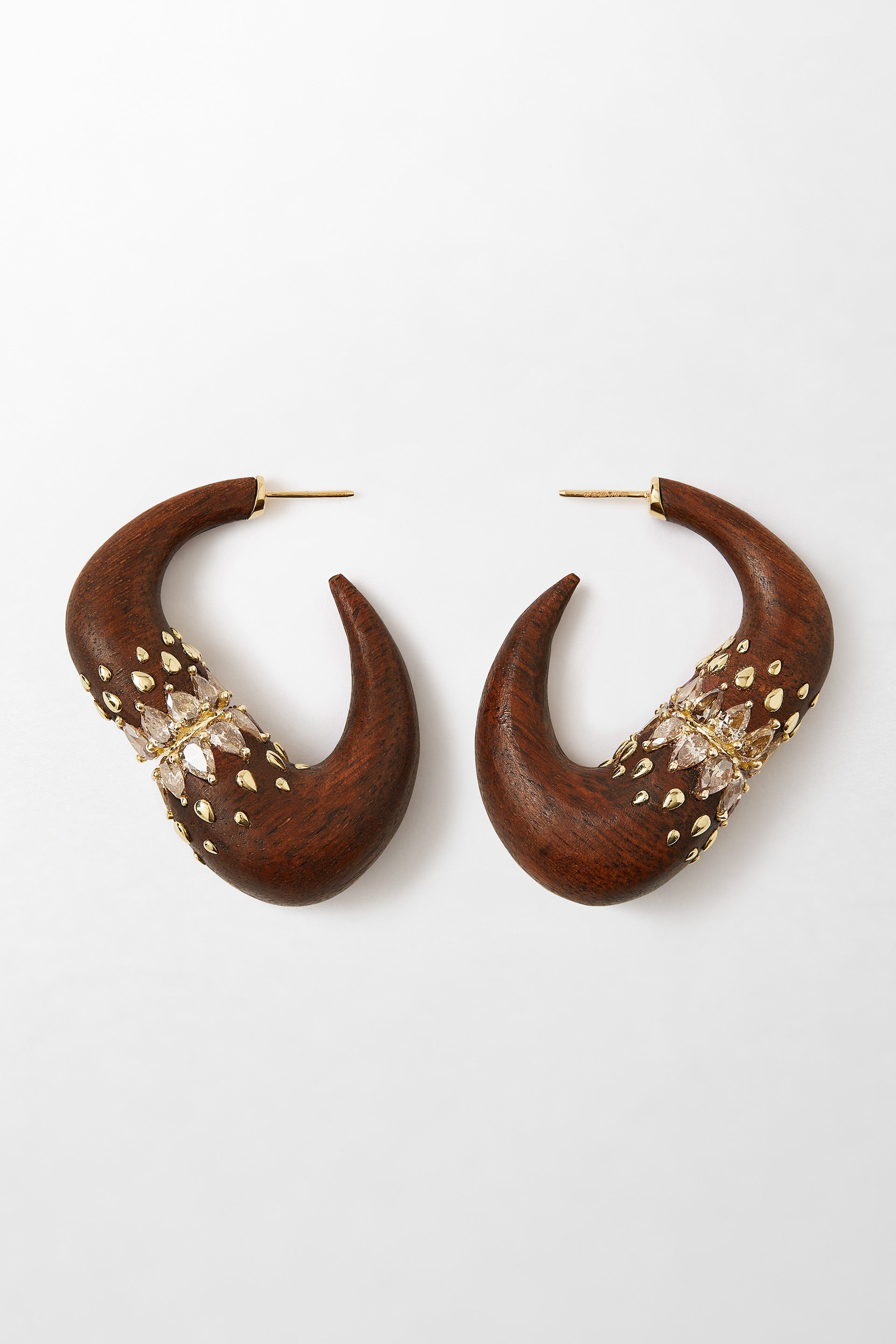 Crafted in 18k yellow gold, set with carats of pear-cut brown diamonds and Louro wood.