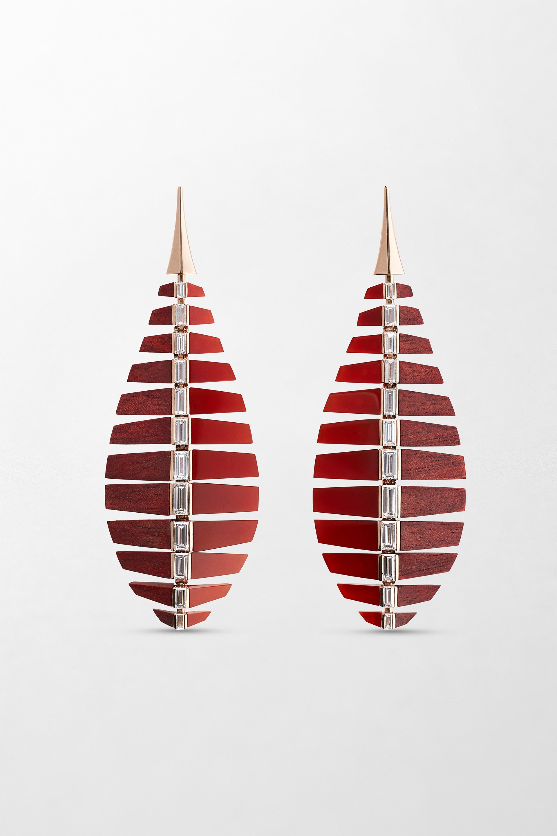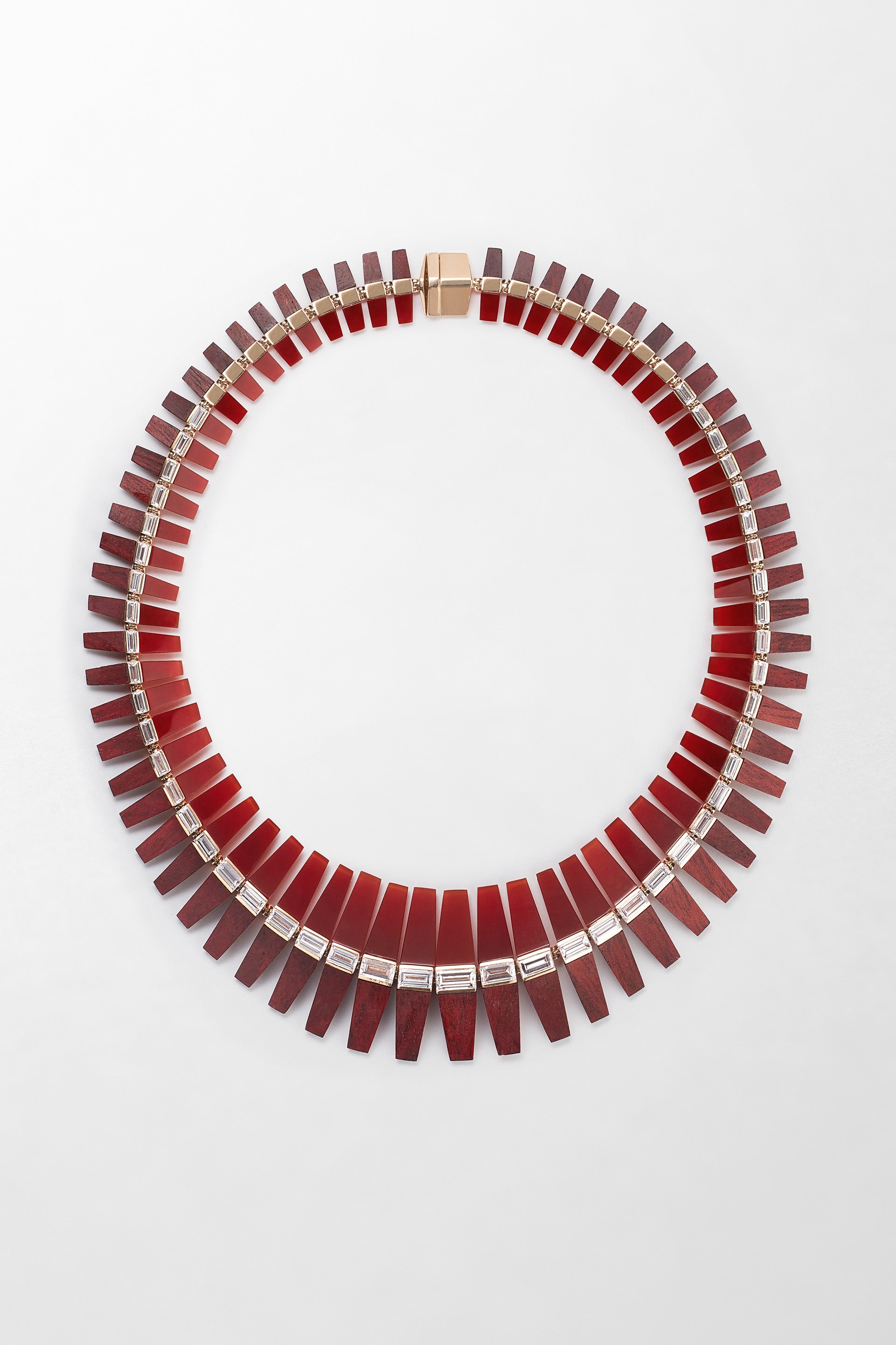 'Deep Vertex’ pieces are shaped by colour and texture, introducing a subtle tension of opposites through the pairing of materials in similar hues from different natures – mineral juxtaposed with organic. Carved ebony is set against onyx, the lustrous dark red of Bloodwood complements carnelian, while cream opal sits alongside iridescent mother of pearl. The result is a body of work that is visually strong, yet meditative and tactile.