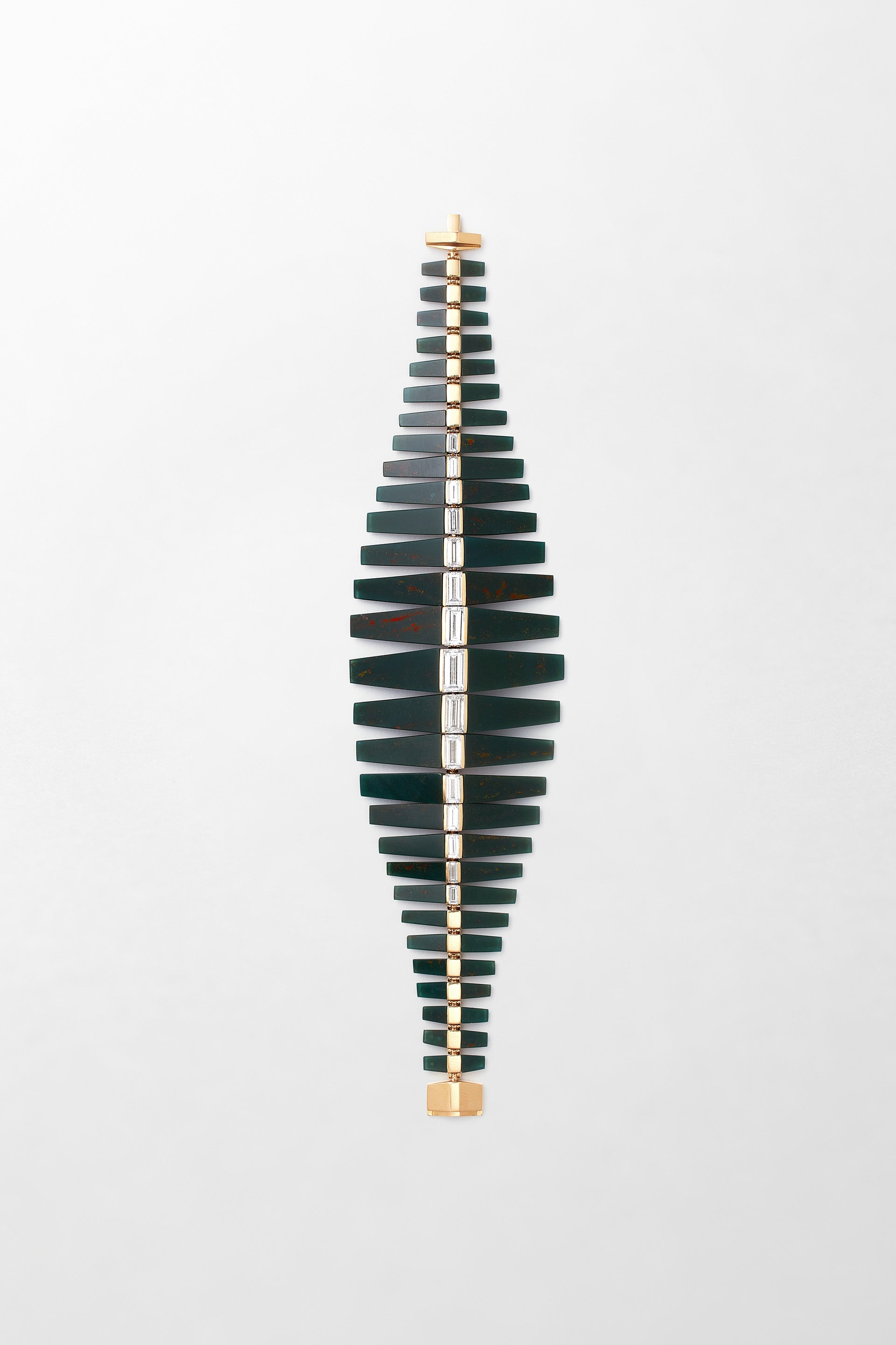 18k yellow gold, set with green jasper and 6.87 carats of baguette cut diamonds.
