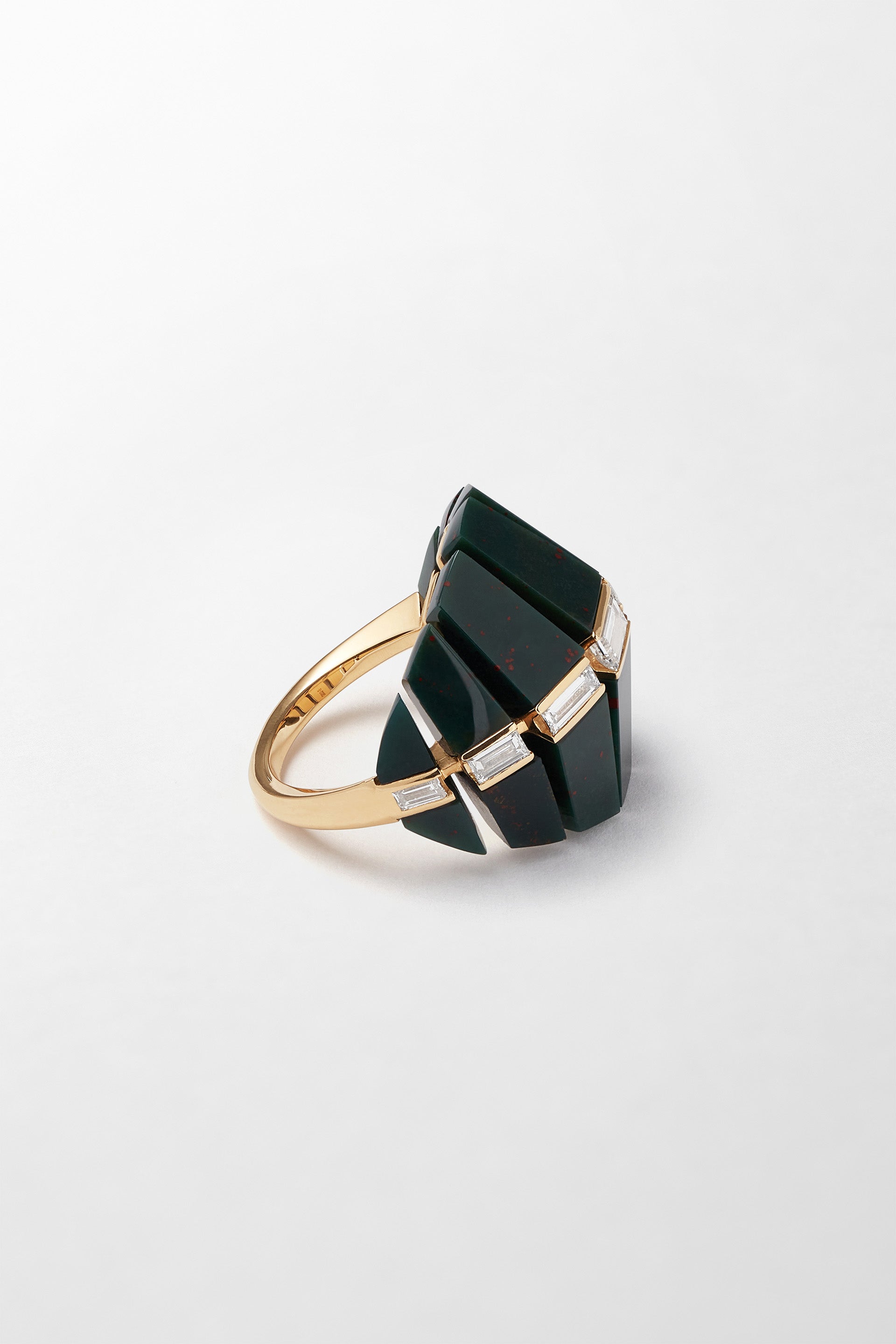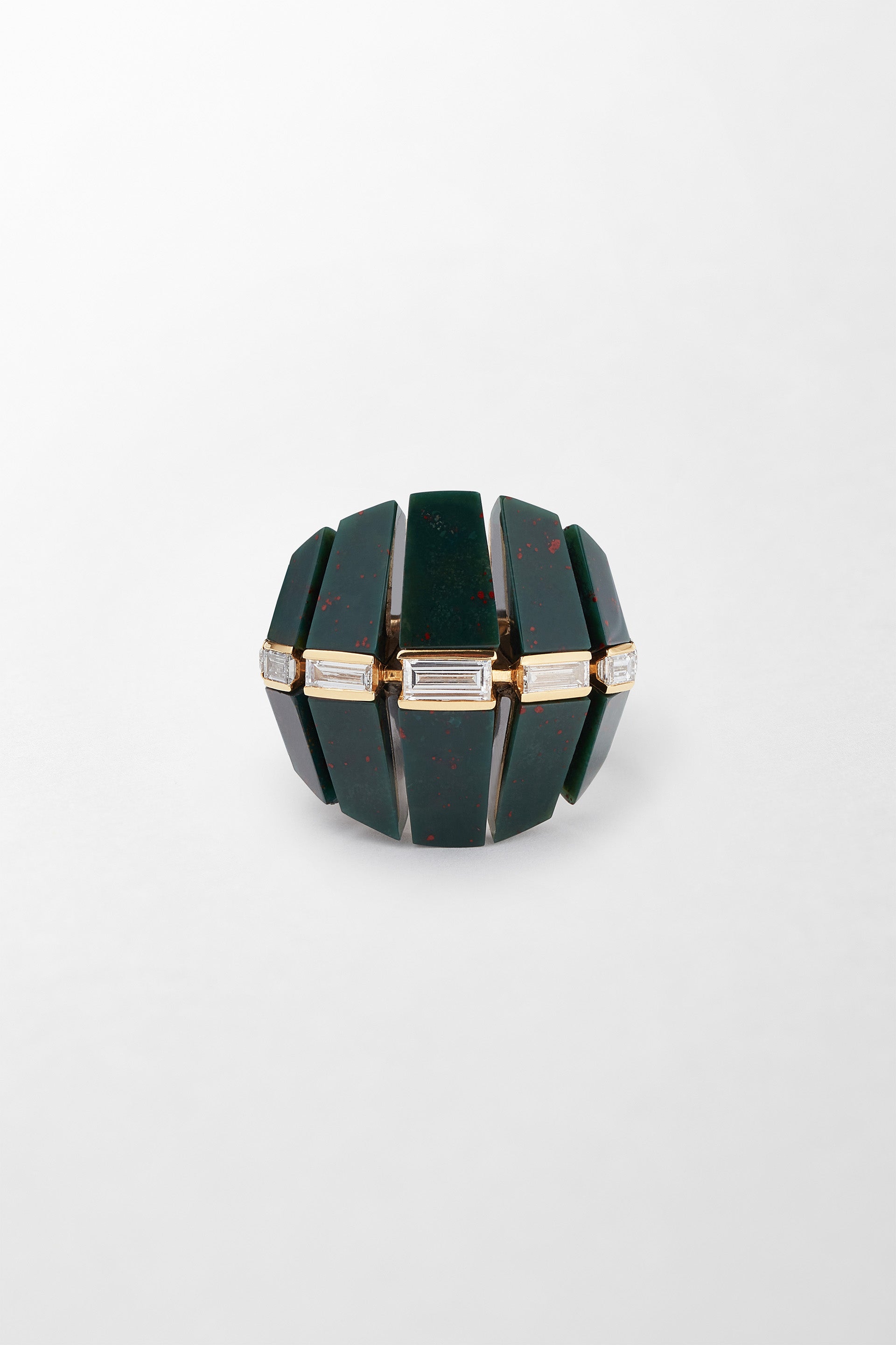 18k yellow gold, set with green jasper and 0.93 carats of baguette cut diamonds.