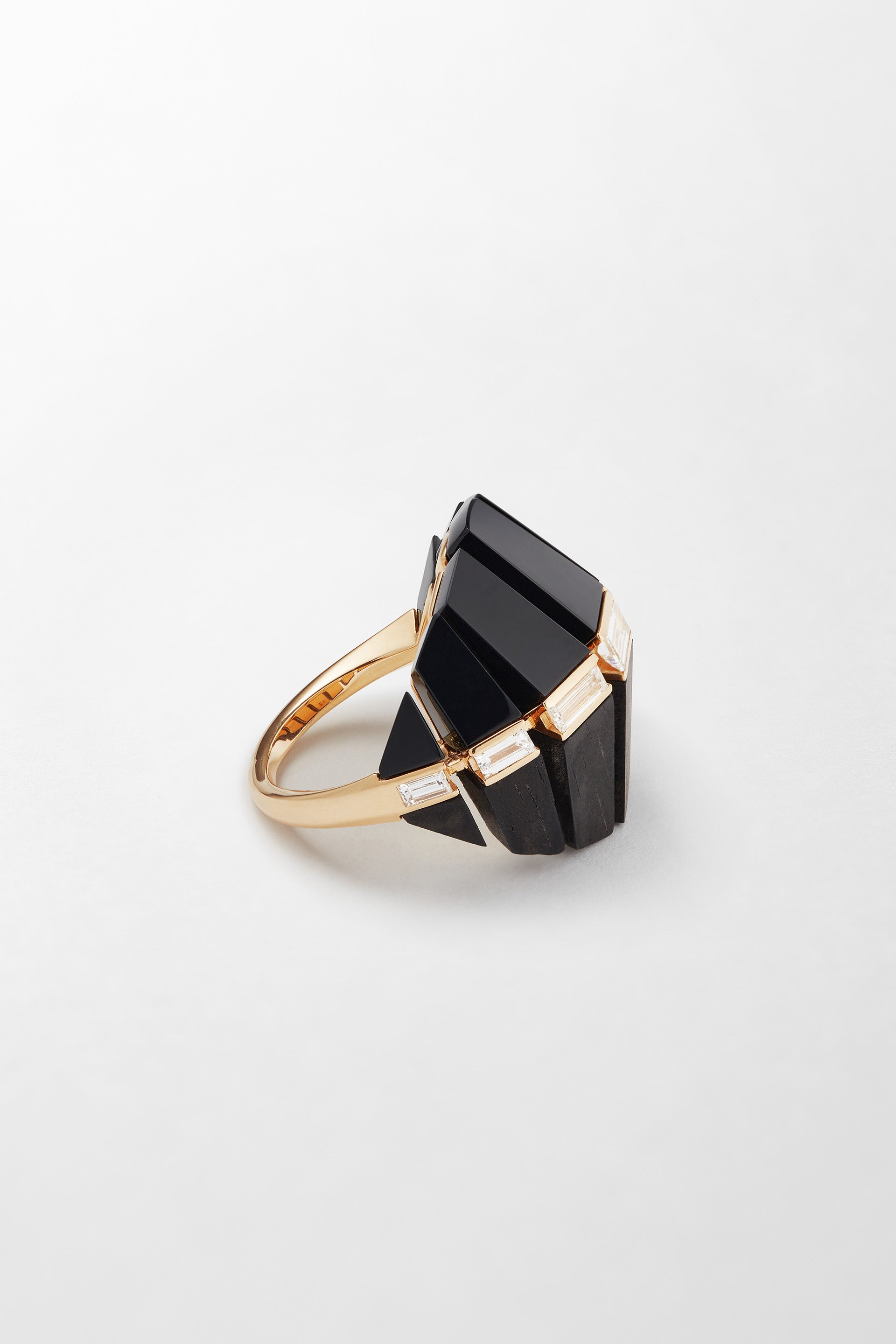 18k yellow gold, set with onyx, Ebony and 0.93 carats of baguette cut diamonds.
