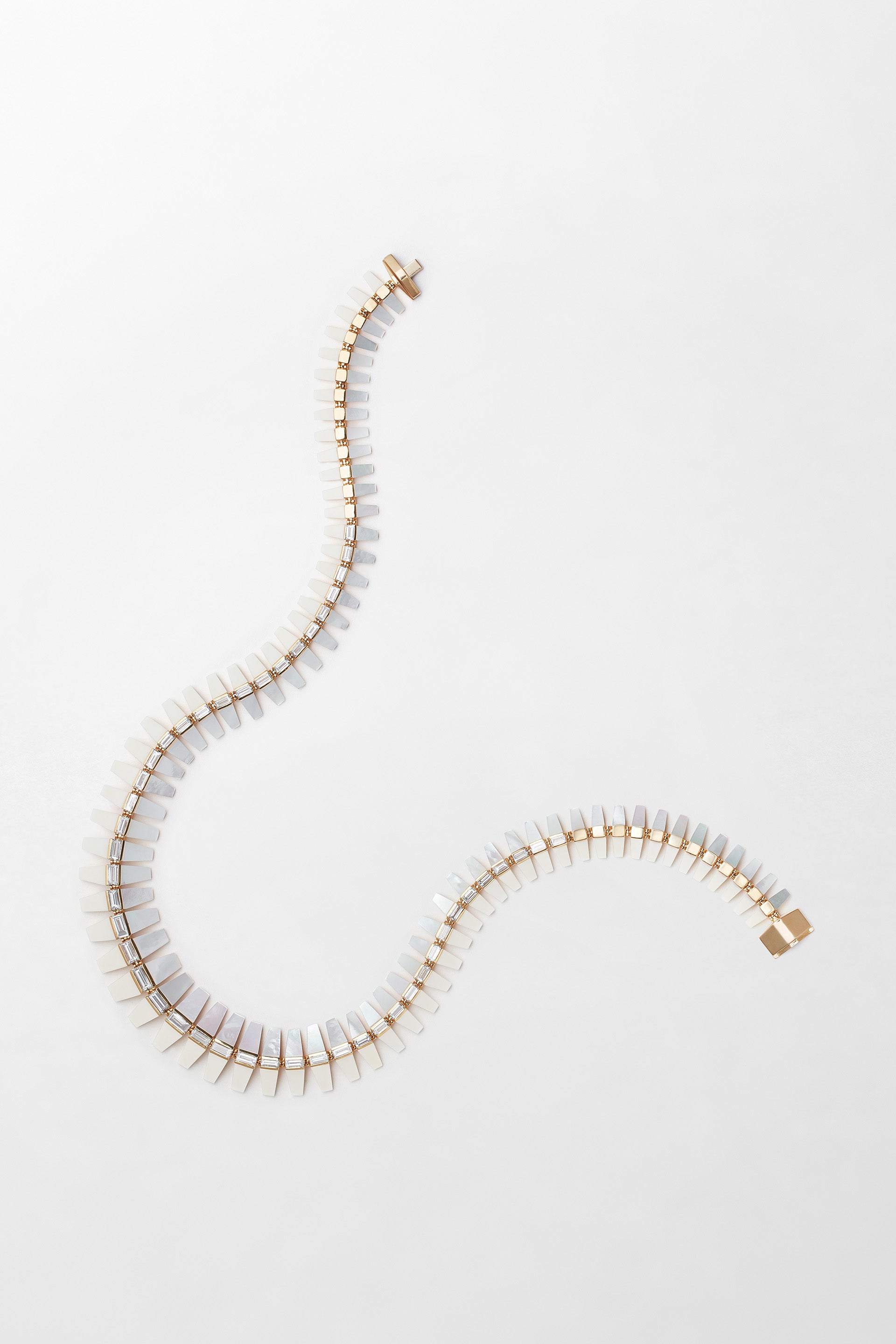 18k yellow gold, set with mother of pearl, white opal and 7.06 carats of baguette cut diamonds.