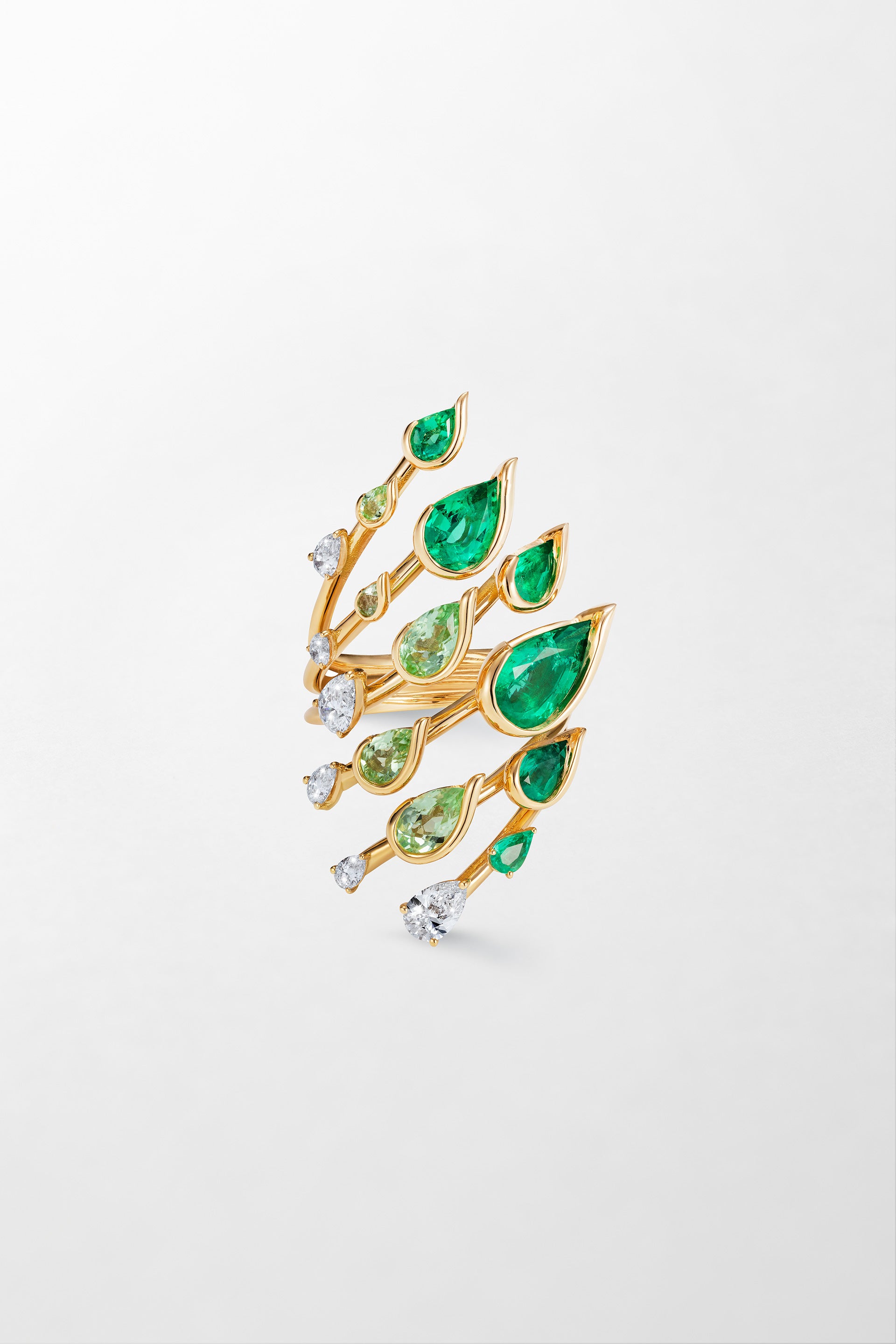 Crafted in 18k yellow gold, set with pear cut Paraiba tourmaline, emerald and 0.76 carat diamonds.