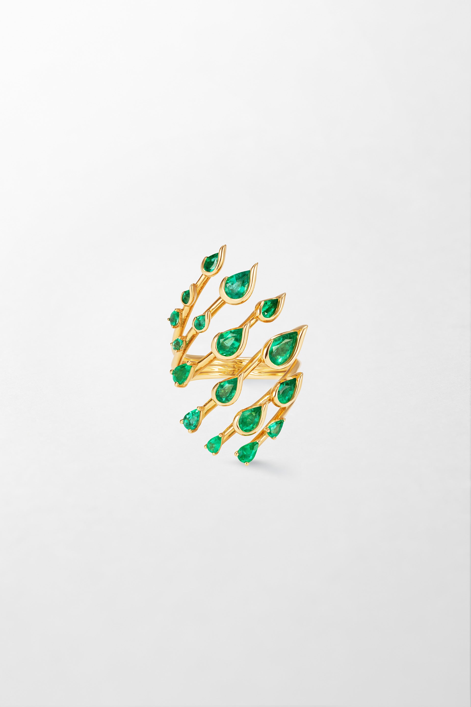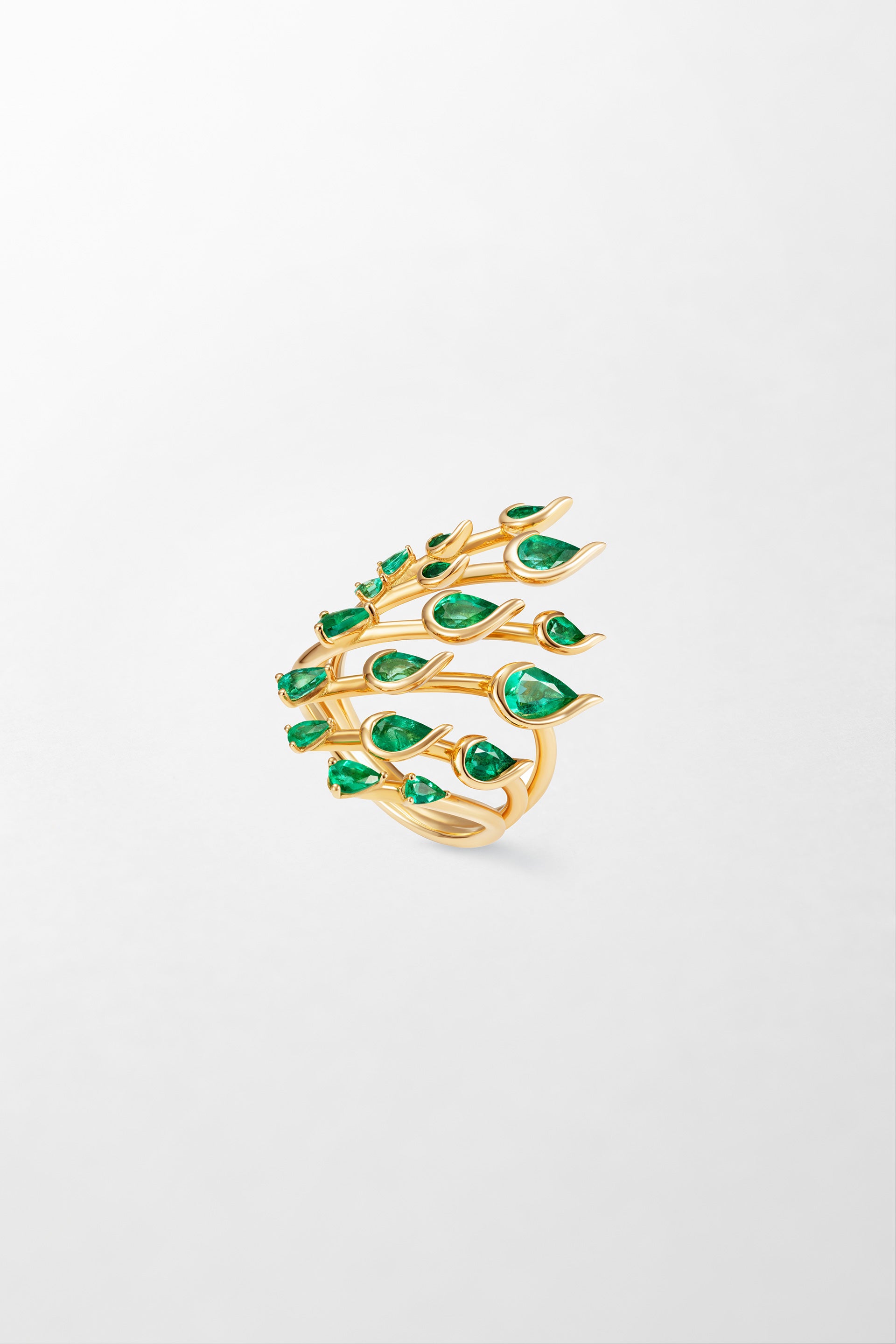 Crafted in 18k yellow gold and set with pear cut emeralds.
