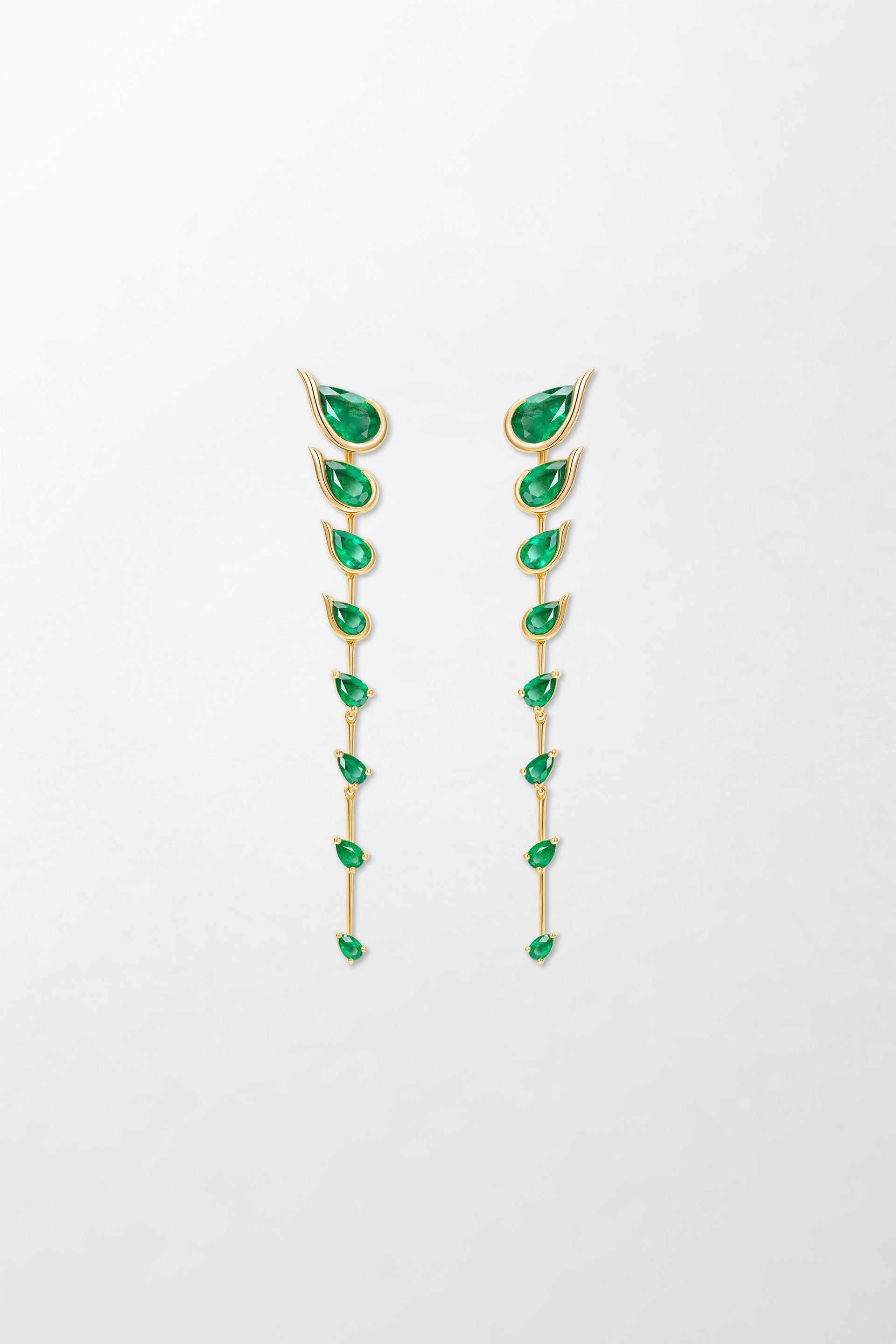 Crafted in 18k yellow gold and set with pear cut emeralds.