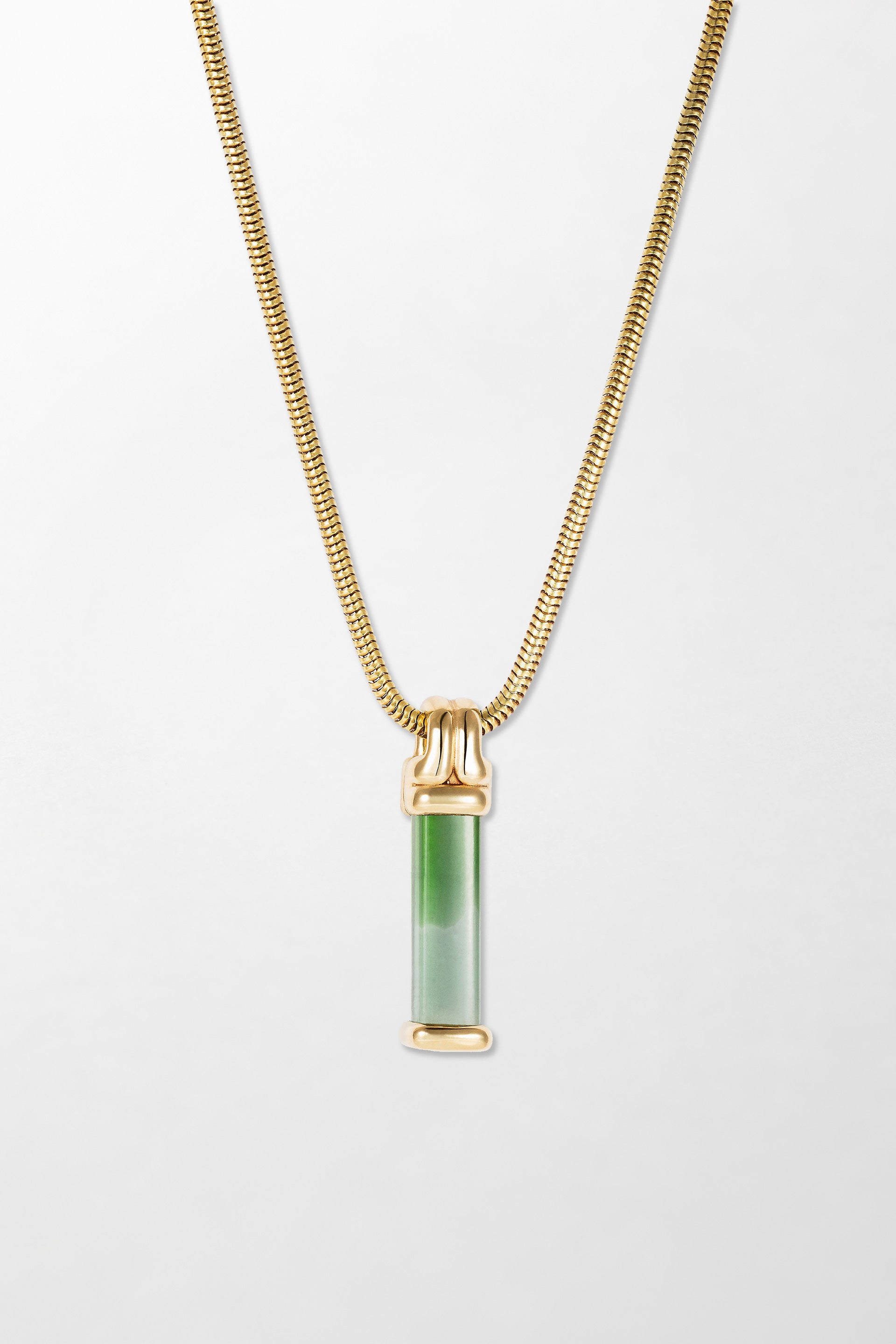 Crafted in 18k yellow gold with hand-carved green tourmaline.
