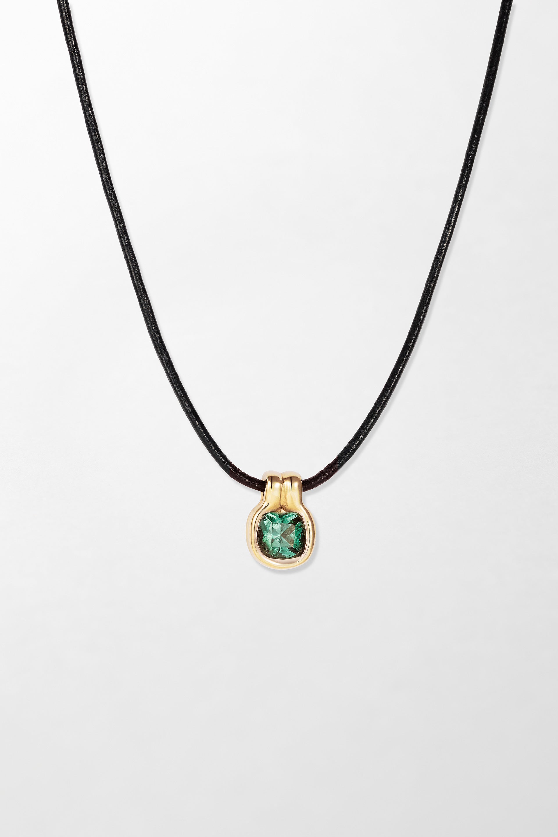 Crafted in 18k yellow gold and set with hand-carved green tourmaline.
