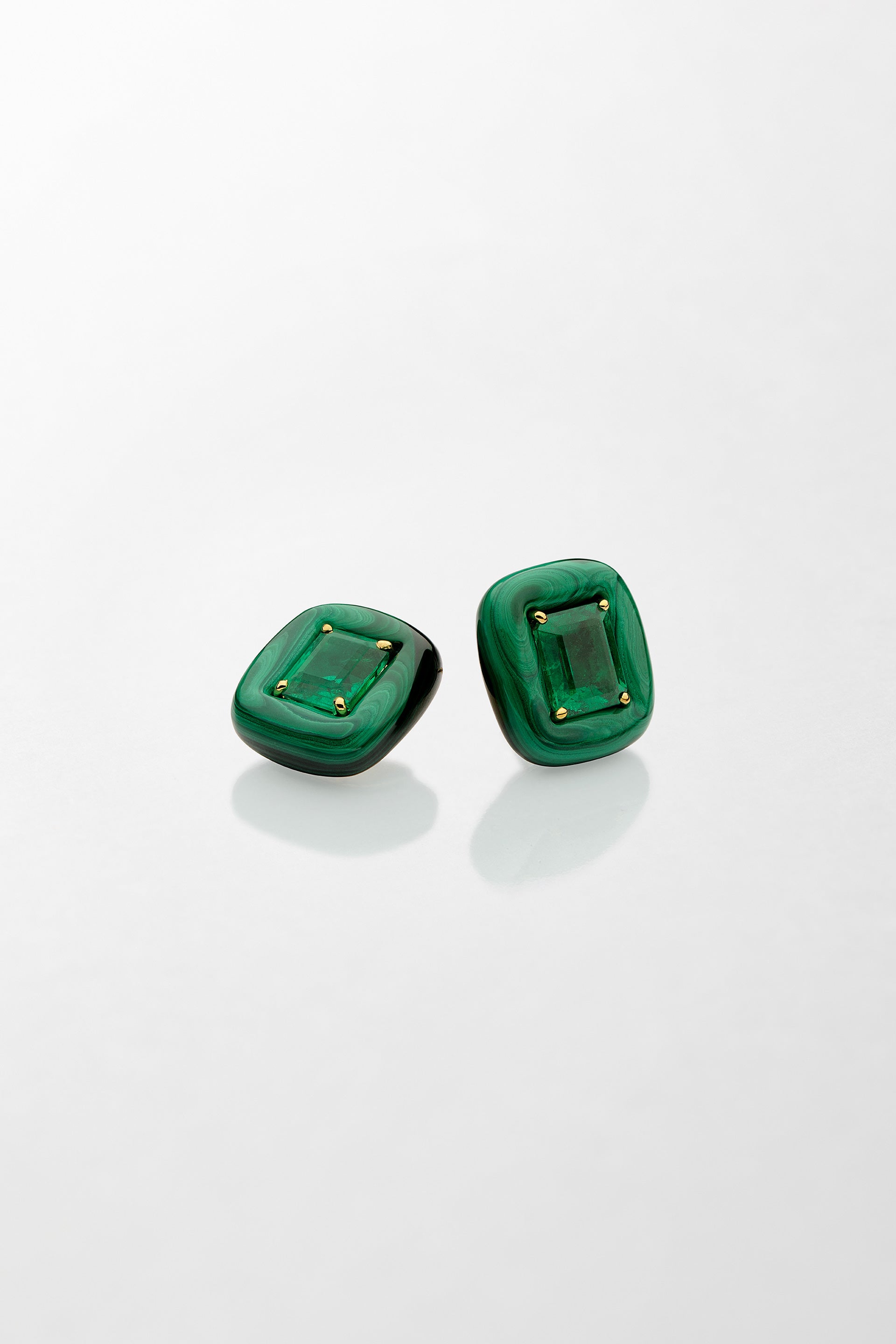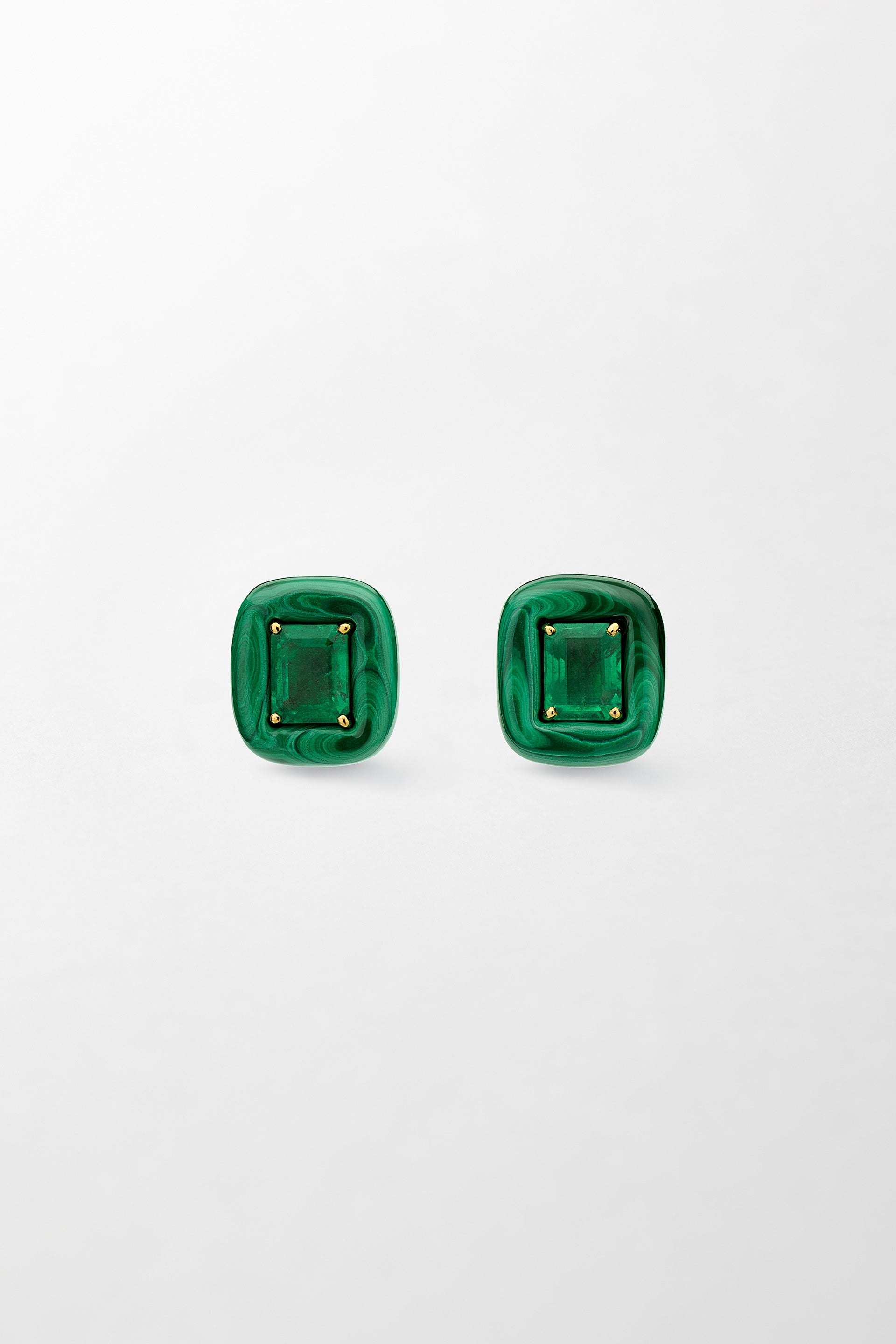 Crafted in 18k yellow gold and set with Brazilian emeralds and hand-carved malachite.