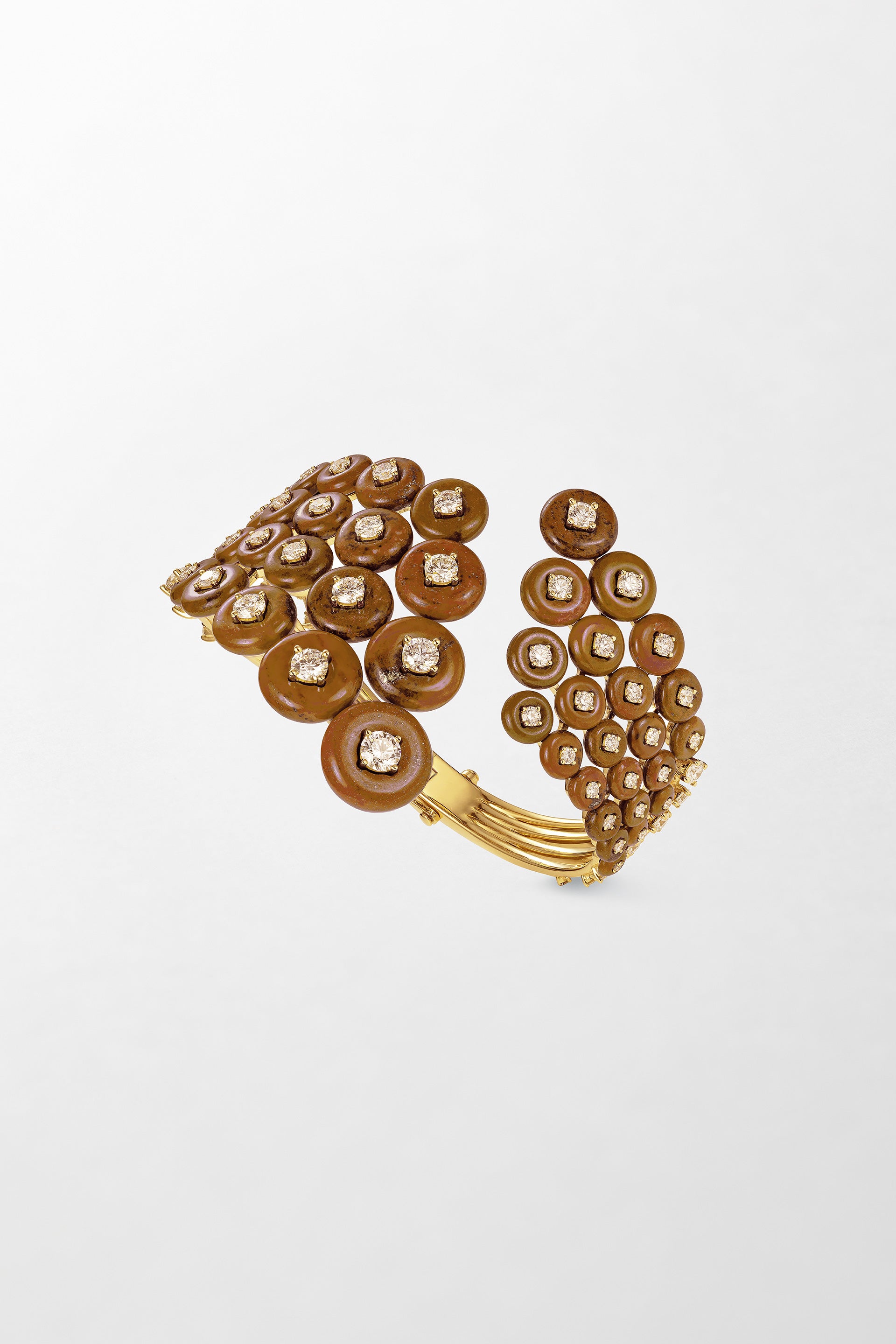 Crafted in 18k yellow gold, set with 7.00 carats of brilliant cut diamonds and hand-carved Brazilian pebblestone.