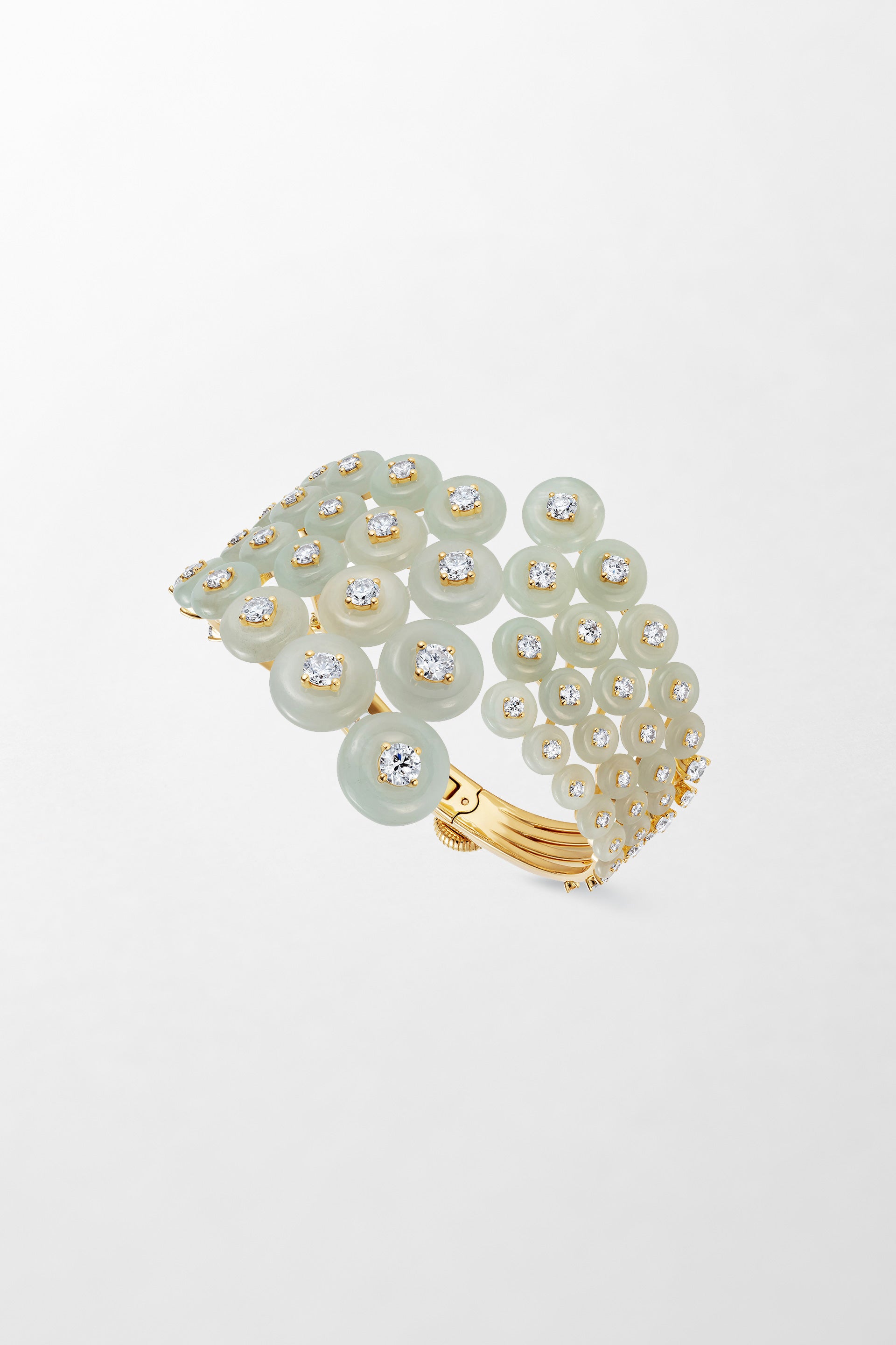 Crafted in 18k yellow gold, set with 7.00 carats of brilliant cut diamonds and hand-carved milky aquamarine.