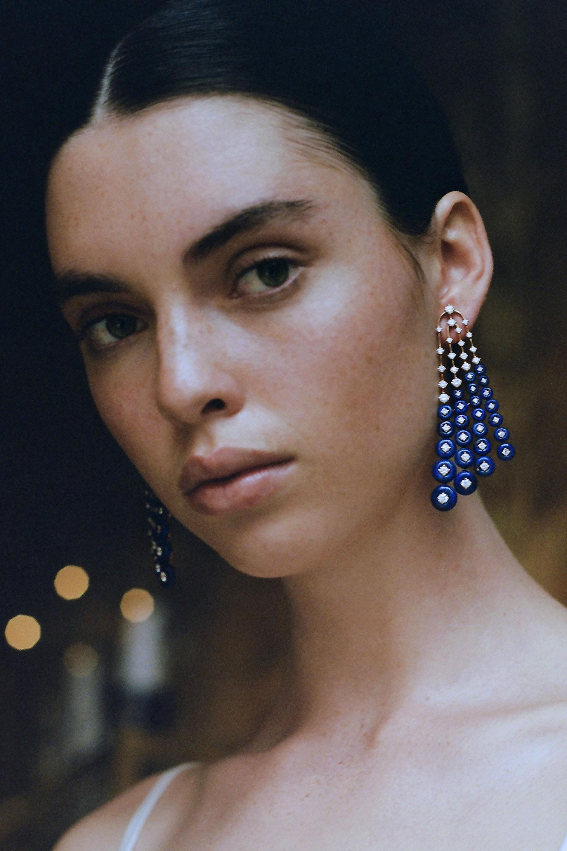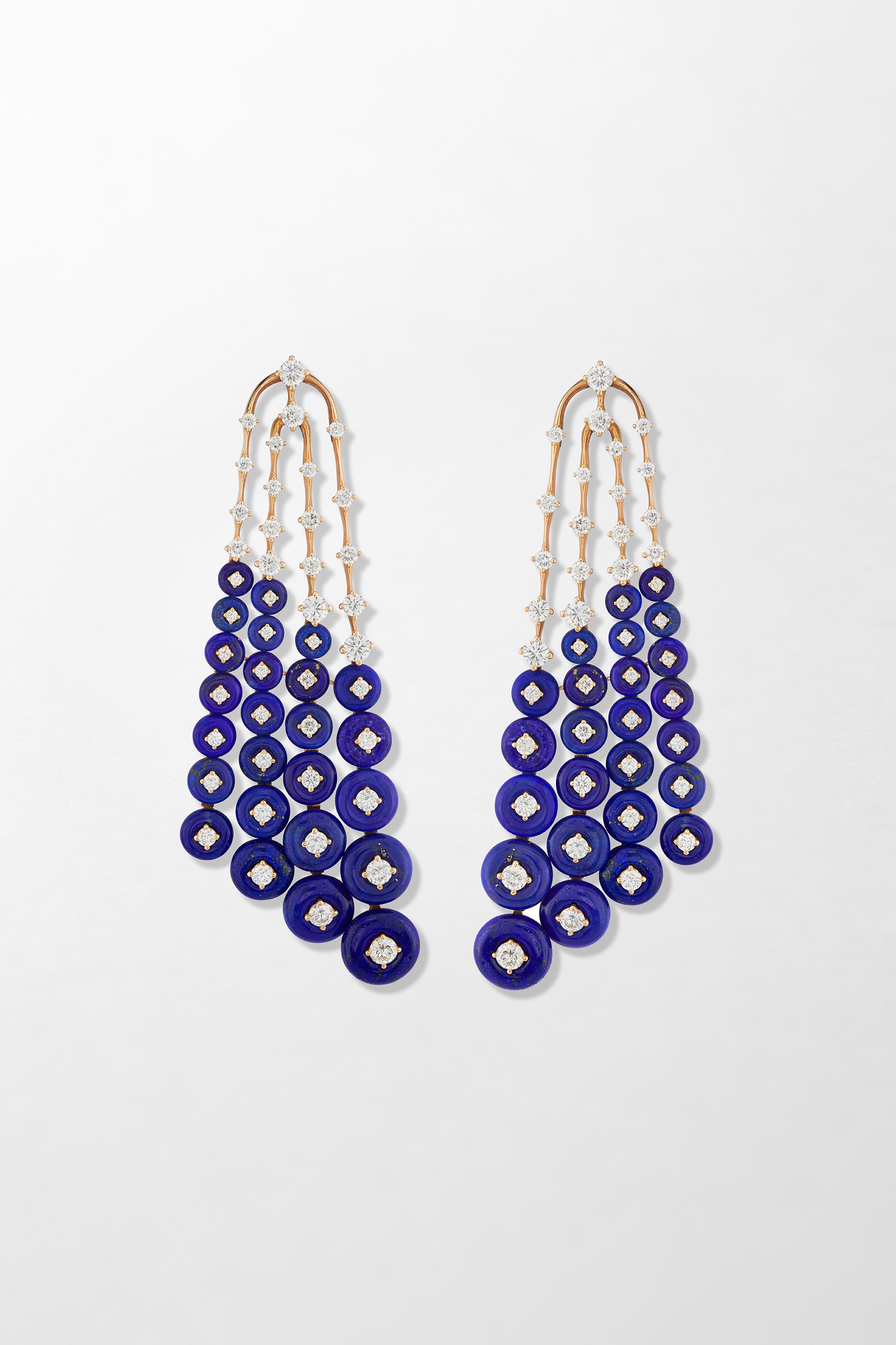 Crafted in 18k rose gold, set with 5.00 carats of brilliant cut diamonds and hand-carved lapis lazuli.