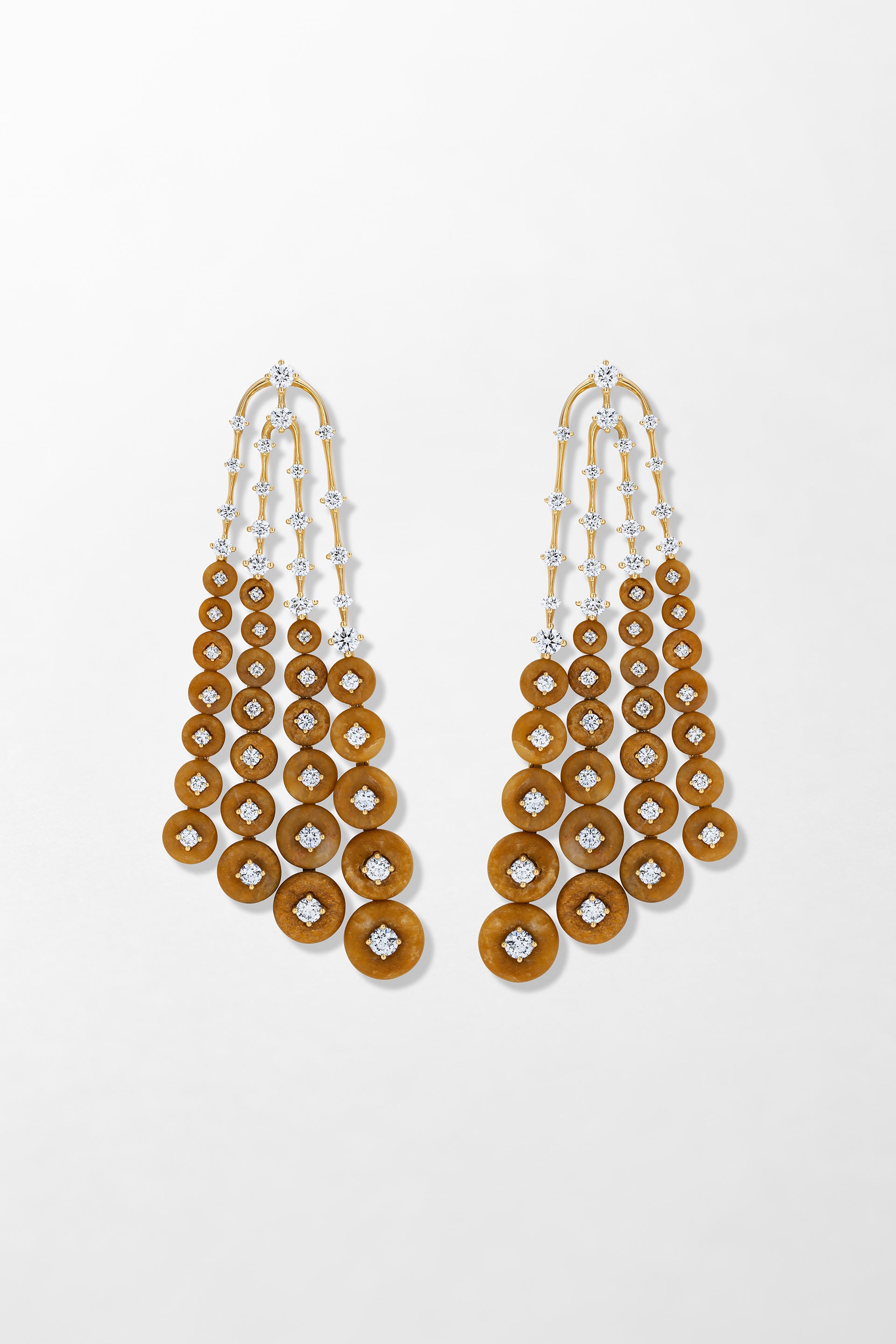 Crafted in 18k yellow gold, set with 5.00 carats of brilliant cut diamonds and hand-carved Brazilian pebblestone.