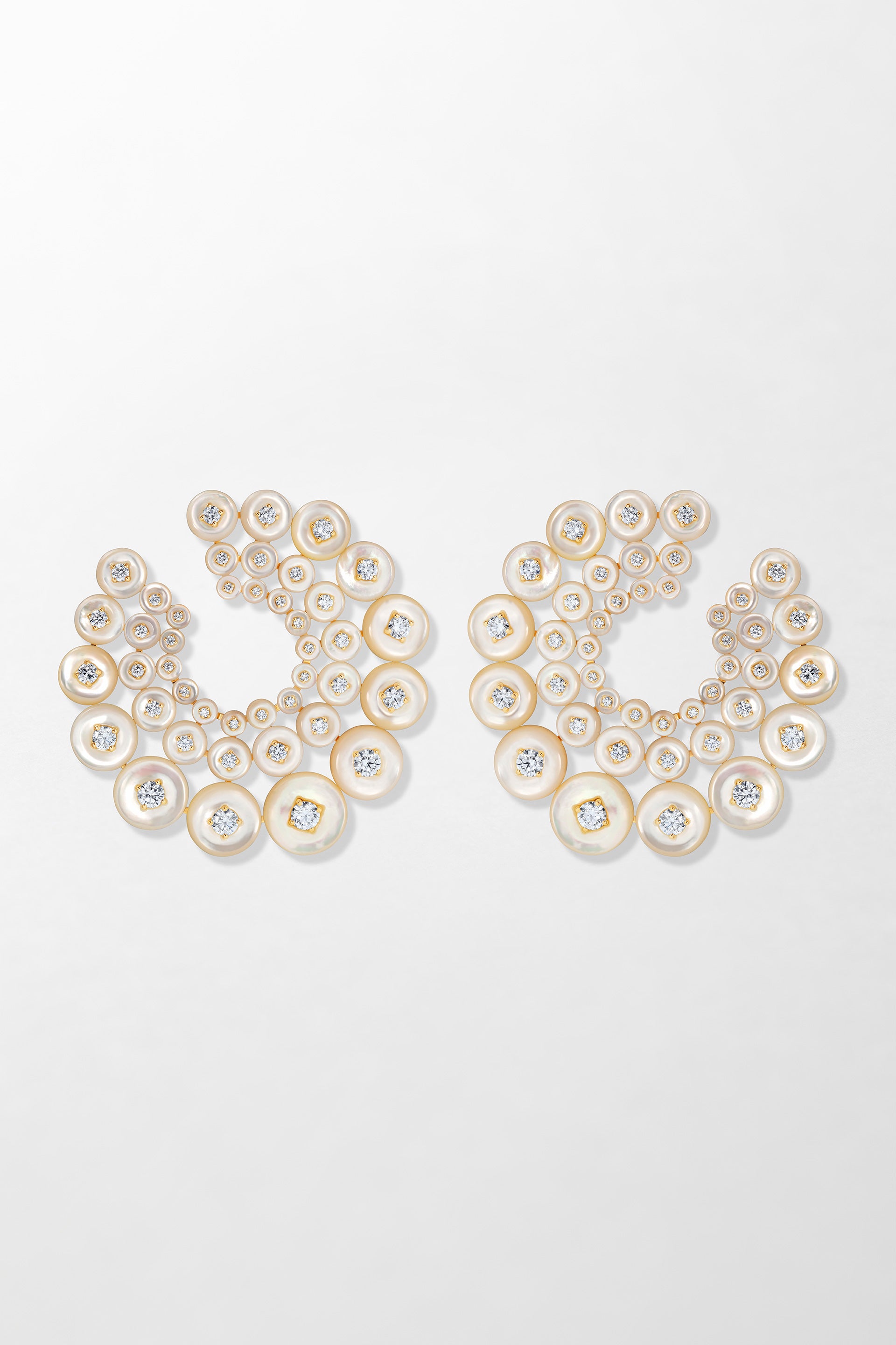 Crafted in 18k yellow gold and set with 4.54 carats of brilliant cut diamonds with hand-carved mother of pearl.