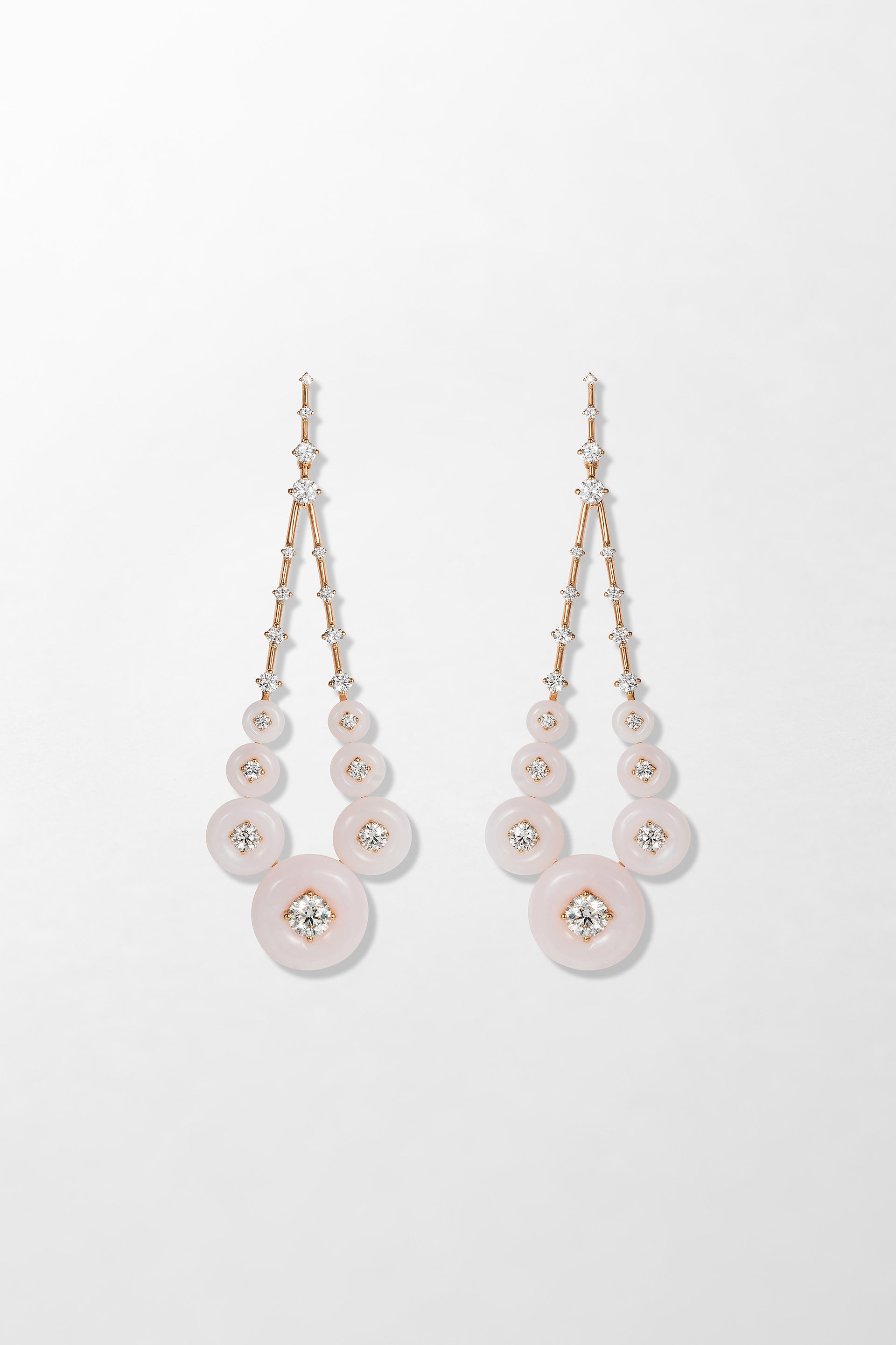 Crafted in 18k rose gold and set with 3.70 carats of brilliant cut diamonds with hand-carved pink opal.