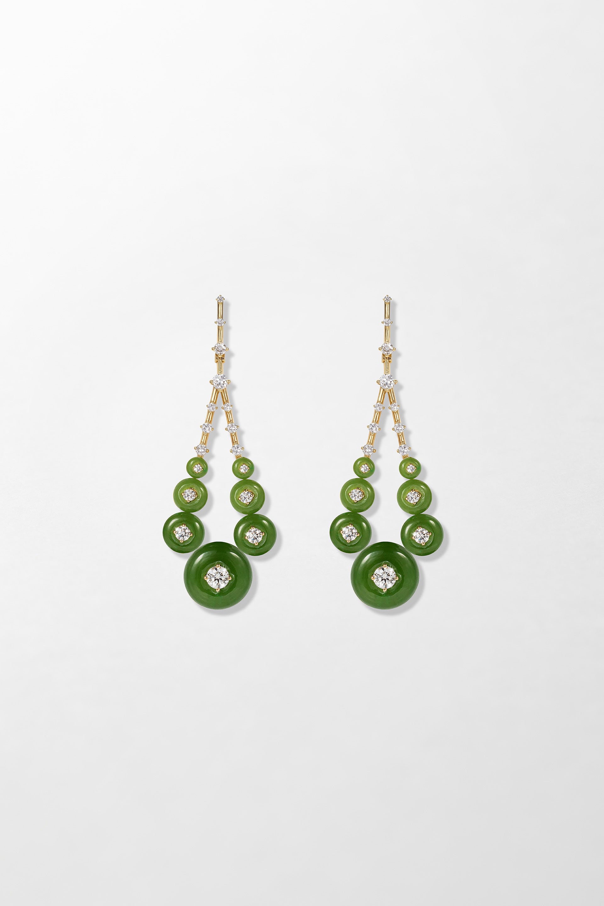 Crafted in 18k yellow gold and set with 1.36 carats of brilliant cut diamonds with hand-carved nephrite jade.