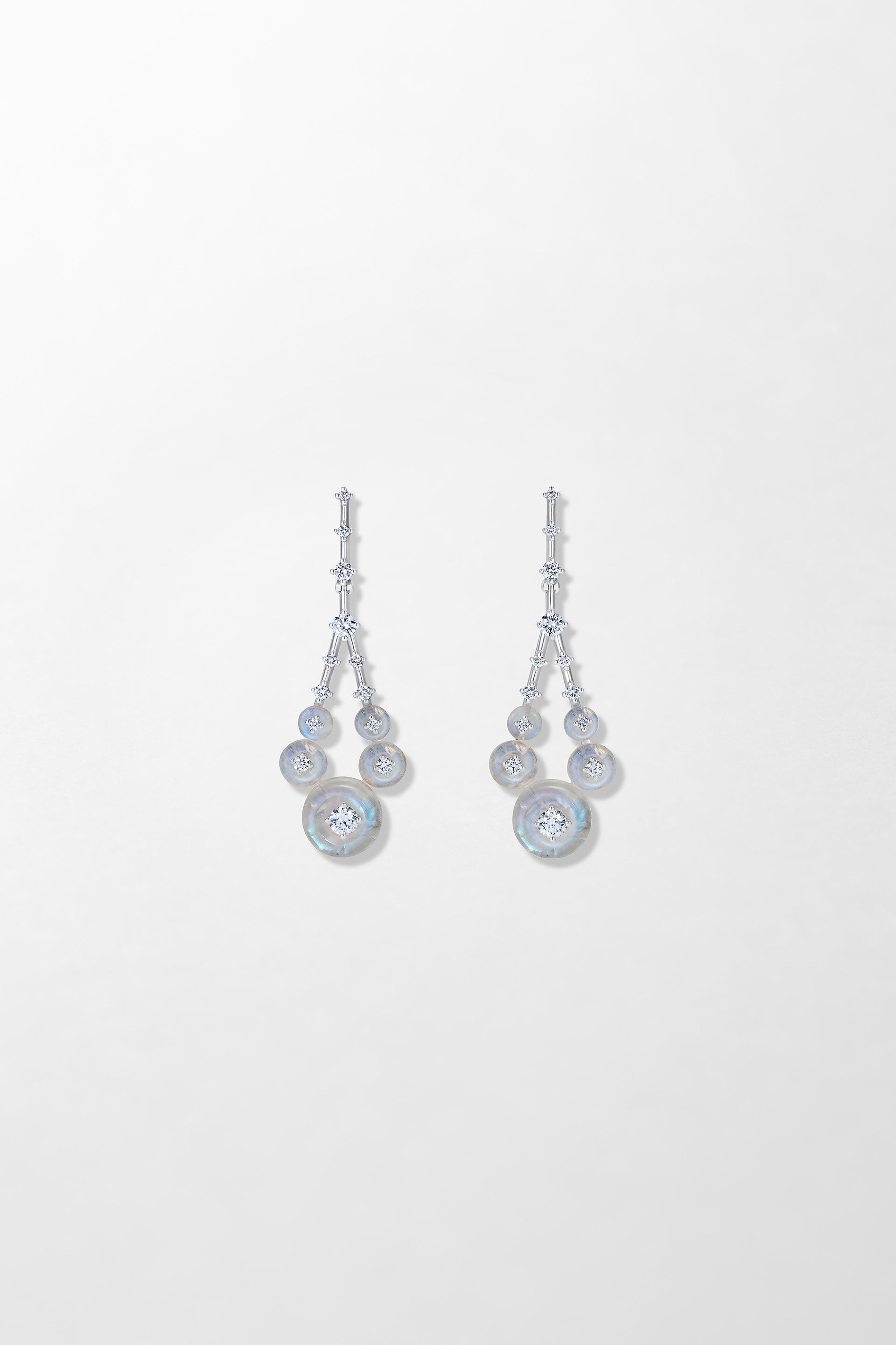 Crafted in 18k white gold and set with 0.85 carats of brilliant cut diamonds with hand-carved moonstone.