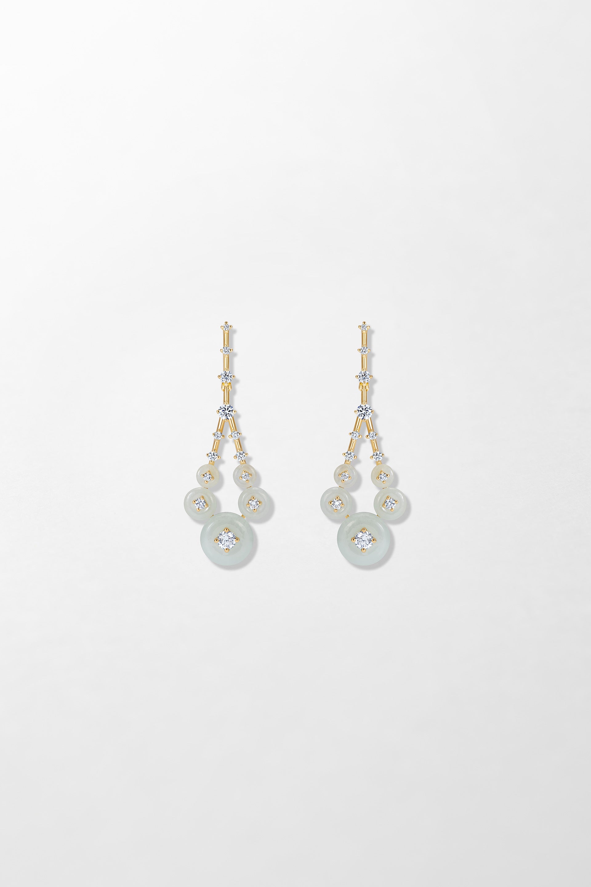 Crafted in 18k yellow gold and set with 0.85 carats of brilliant cut diamonds with hand-carved milky aquamarine.