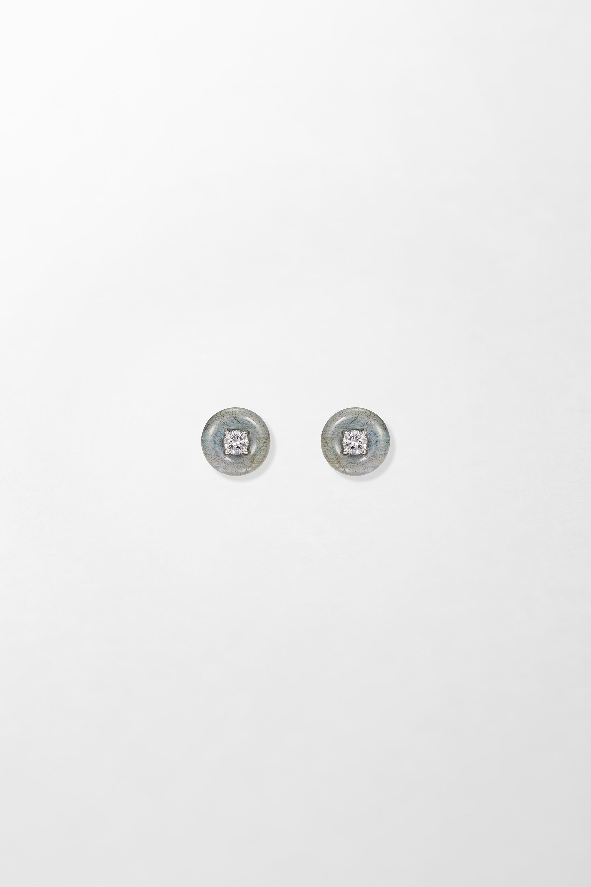 Crafted in 18k white gold and set with 0.20 carats of brilliant cut diamonds with hand-carved labradorite.