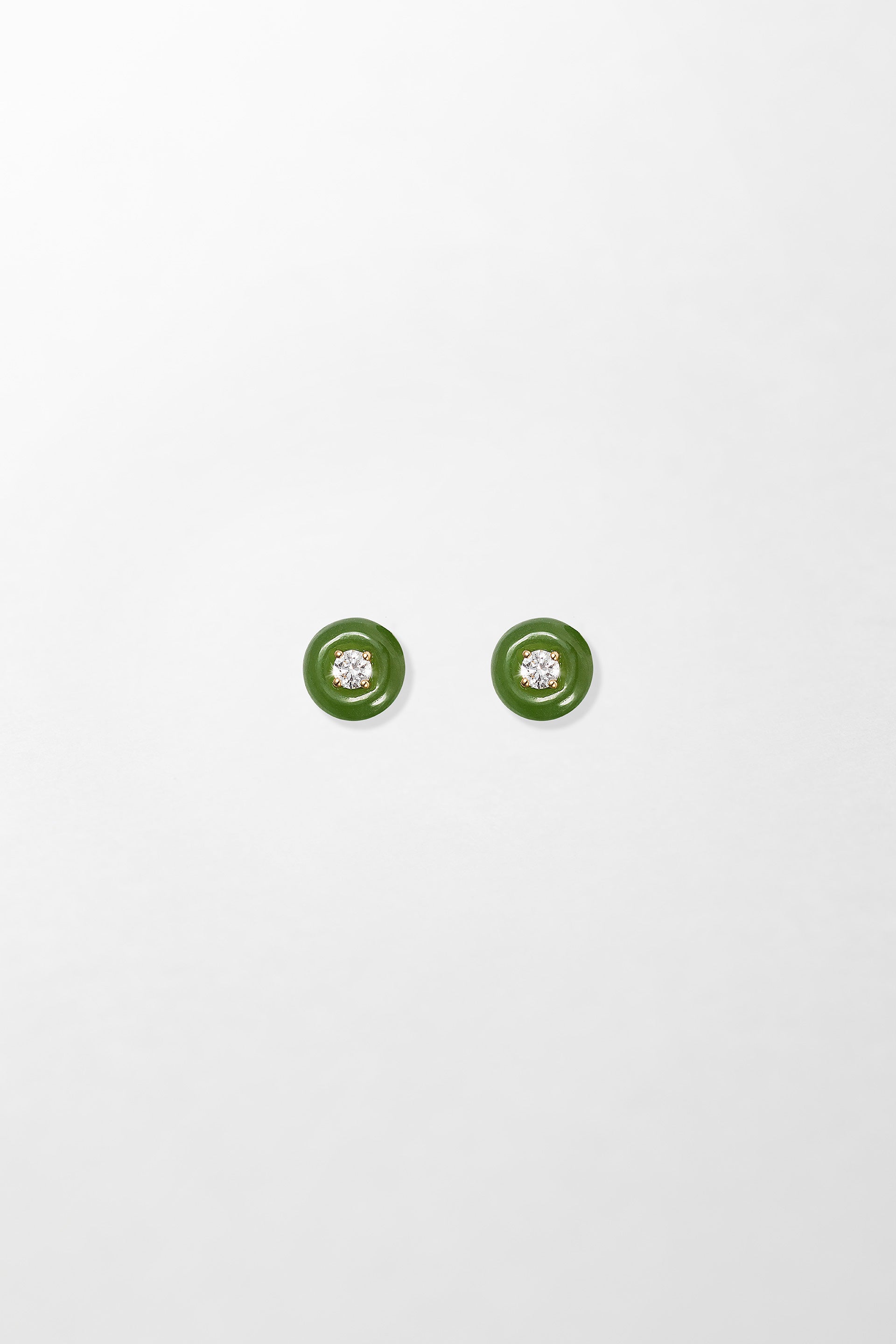 Crafted in 18k yellow gold and set with 0.20 carats of brilliant cut diamonds with hand-carved nephrite jade.