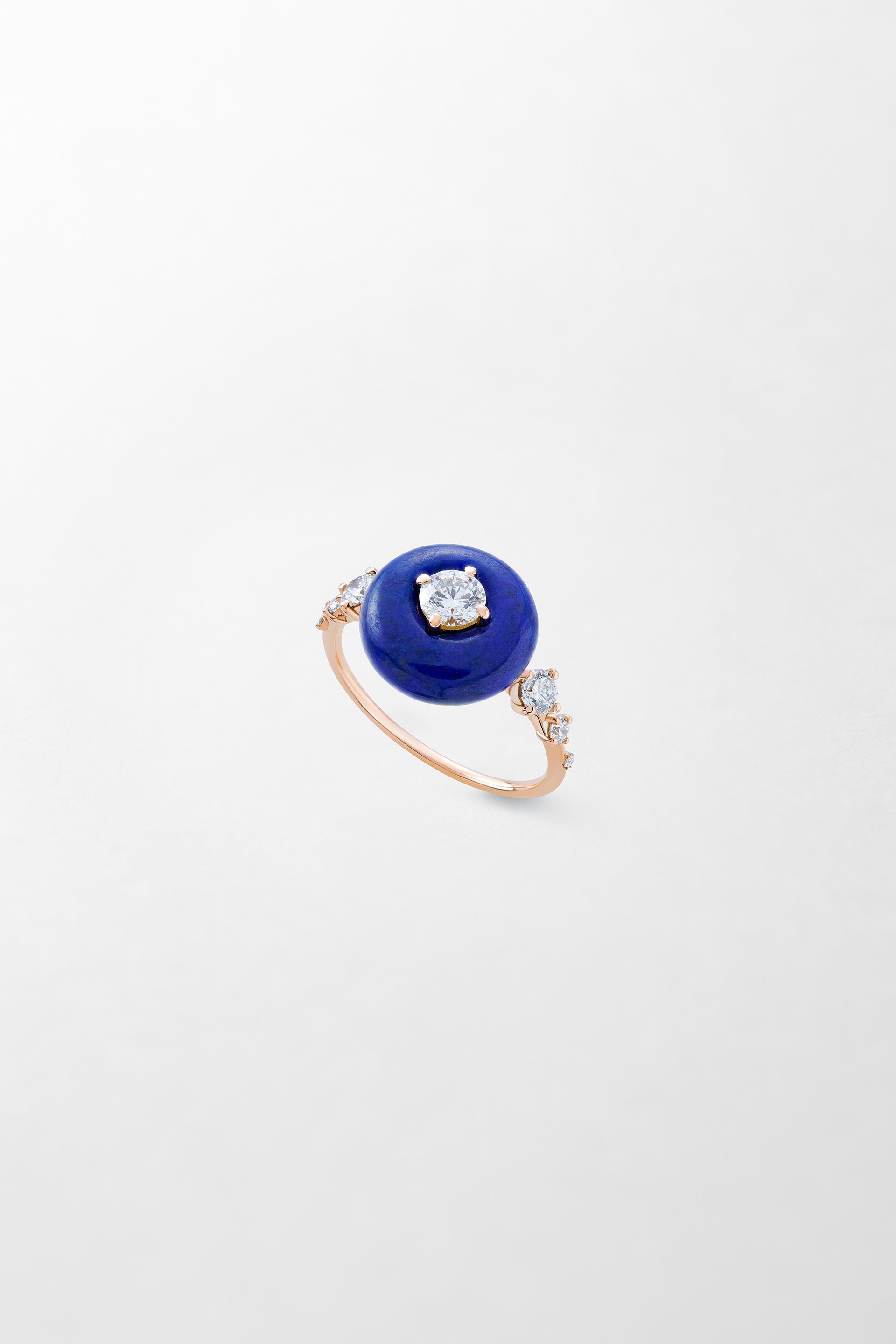 Crafted in 18k rose gold and set with a 0.52 carat brilliant cut diamond and hand-carved lapis lazuli.