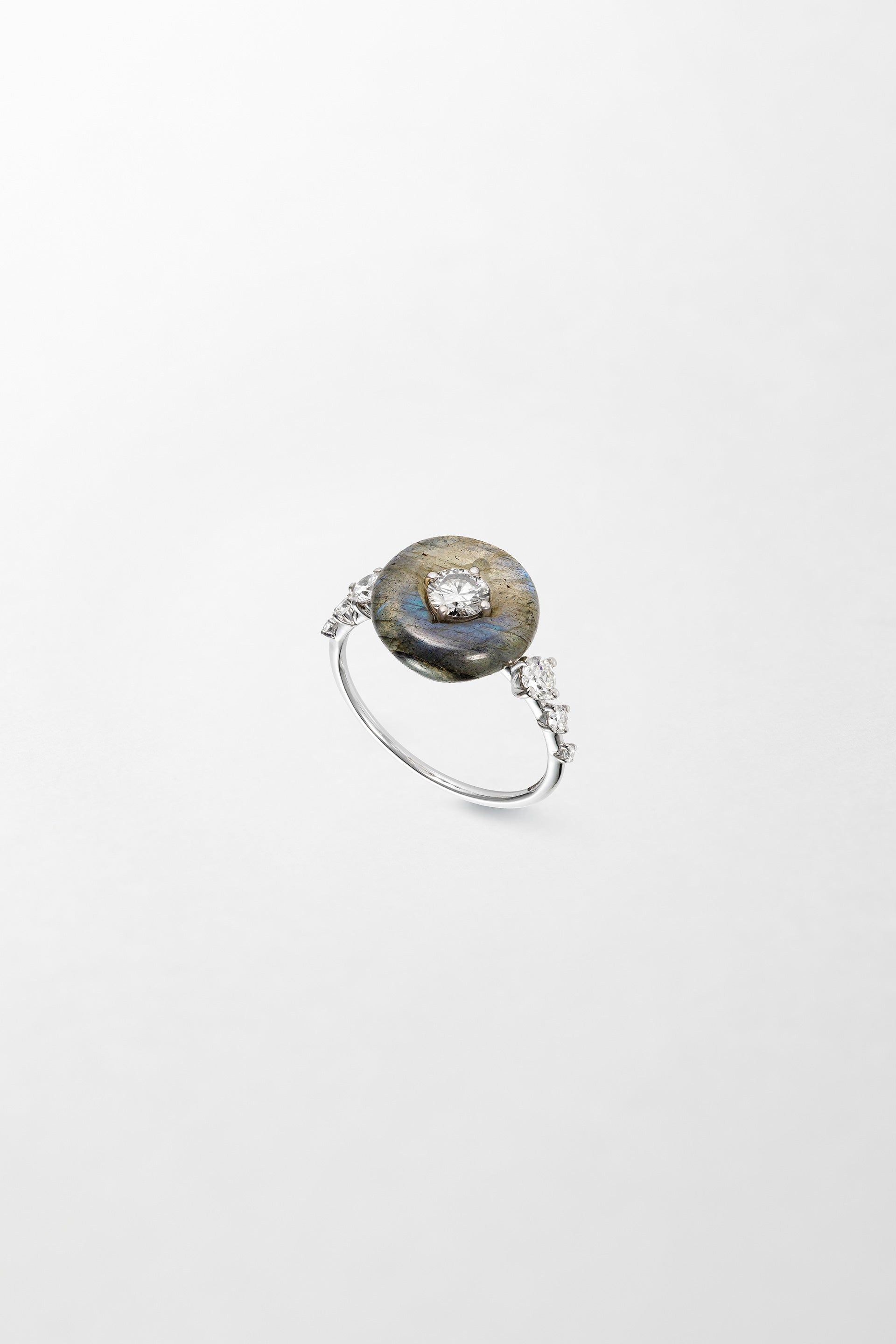 Crafted in 18k white gold and set with a 0.52 carat brilliant cut diamond and hand-carved labradorite.
