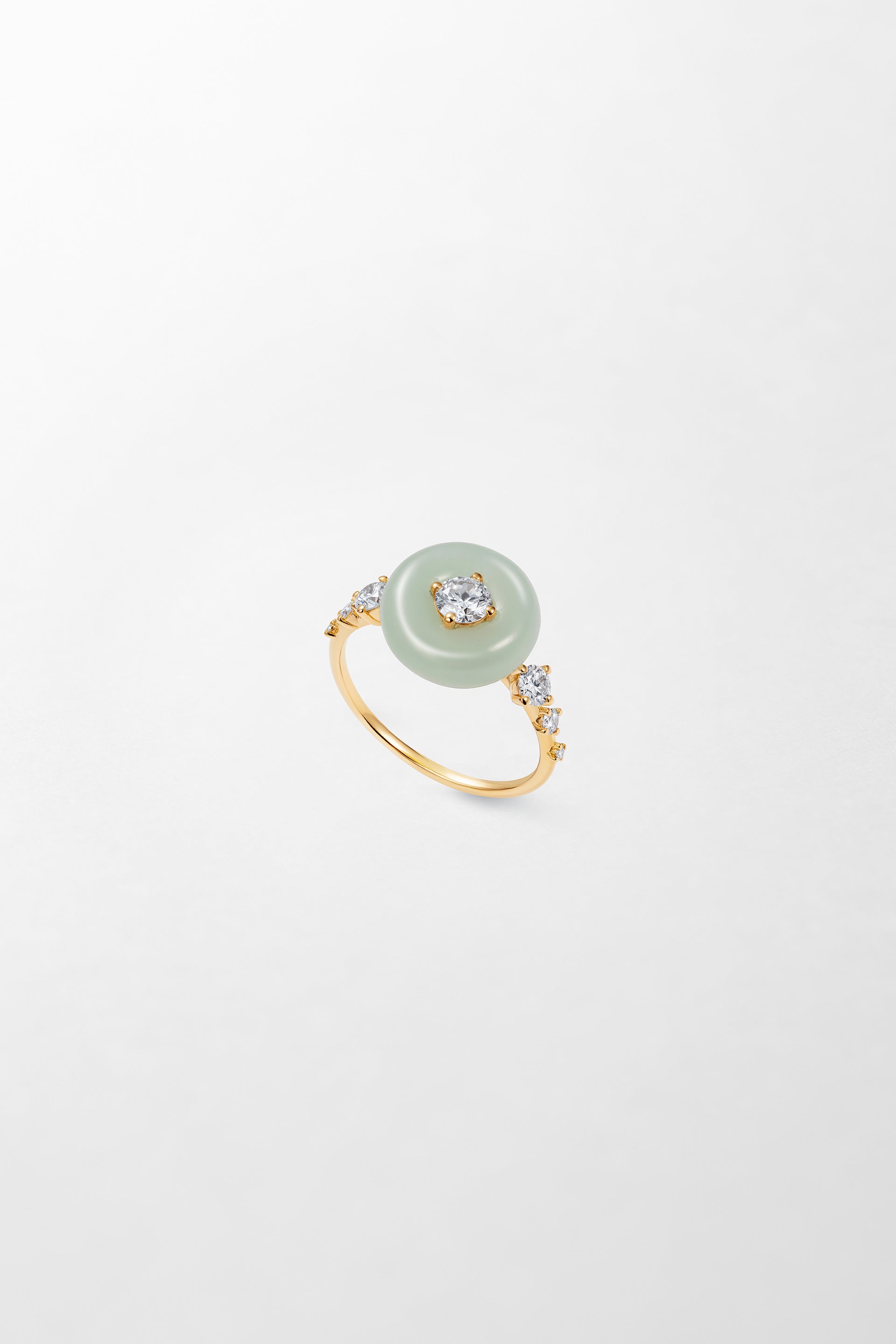 Crafted in 18k yellow gold and set with 0.52 carats of a brilliant cut diamond and hand-carved milky aquamarine.