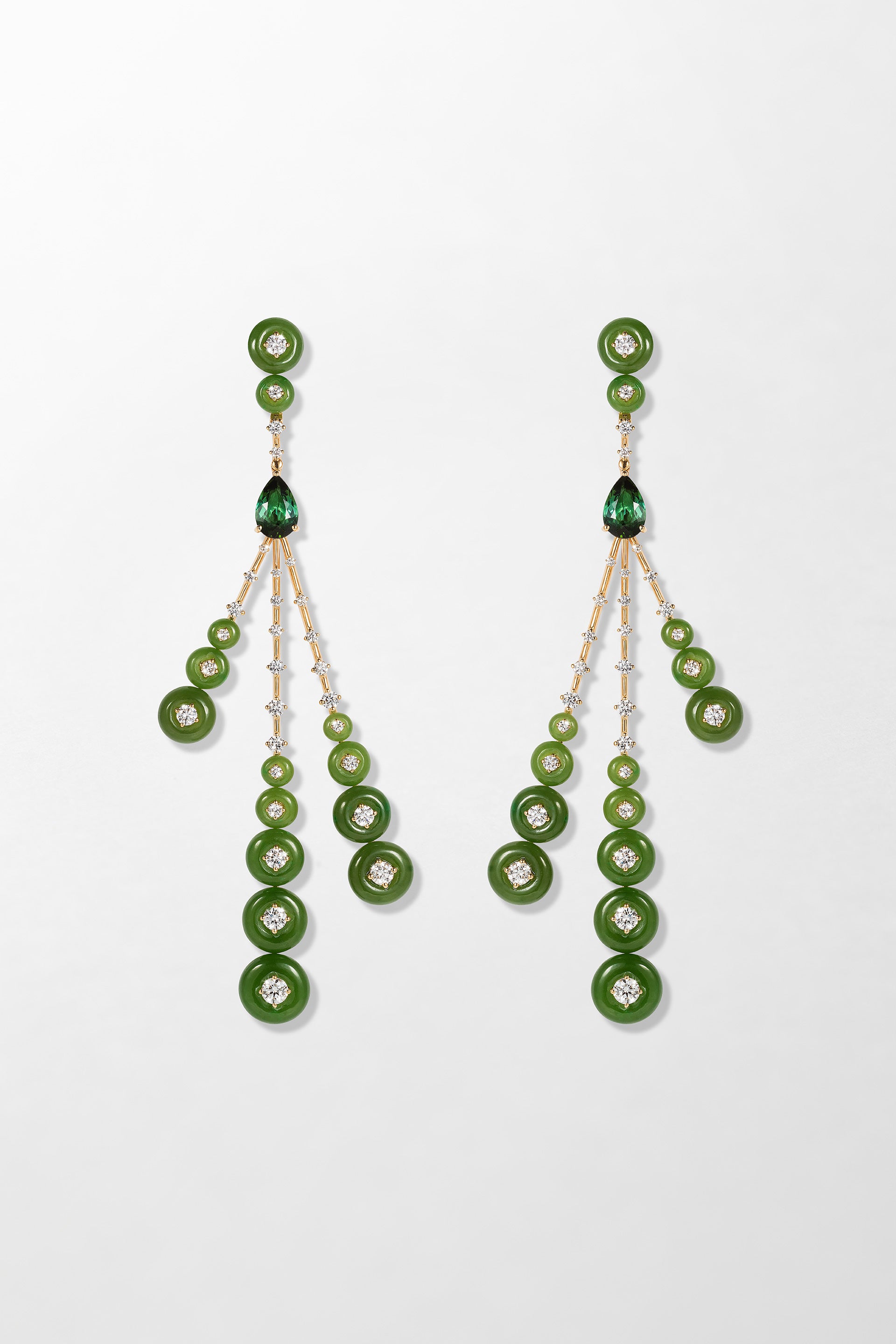 Crafted in 18k yellow gold diamond, set with 2.87 carats of brilliant cut diamonds with hand-carved nephrite jade and green tourmaline.